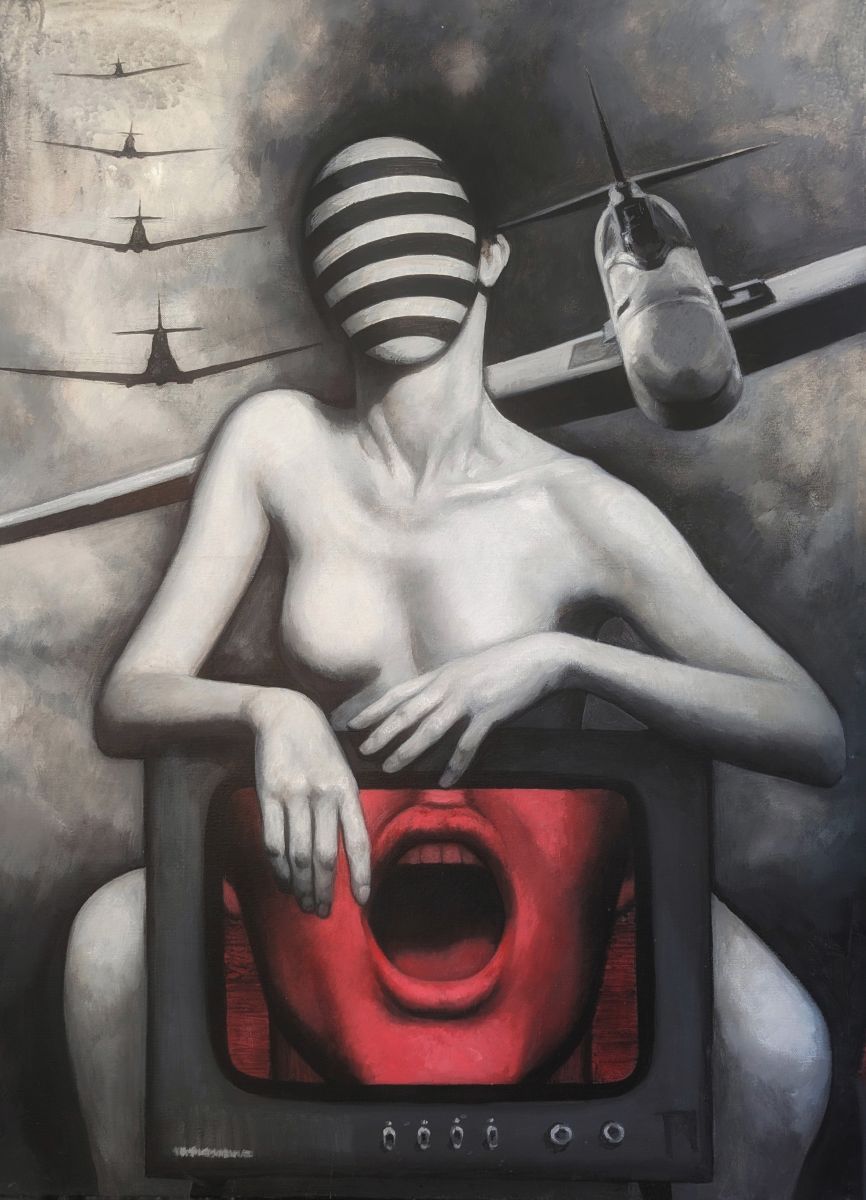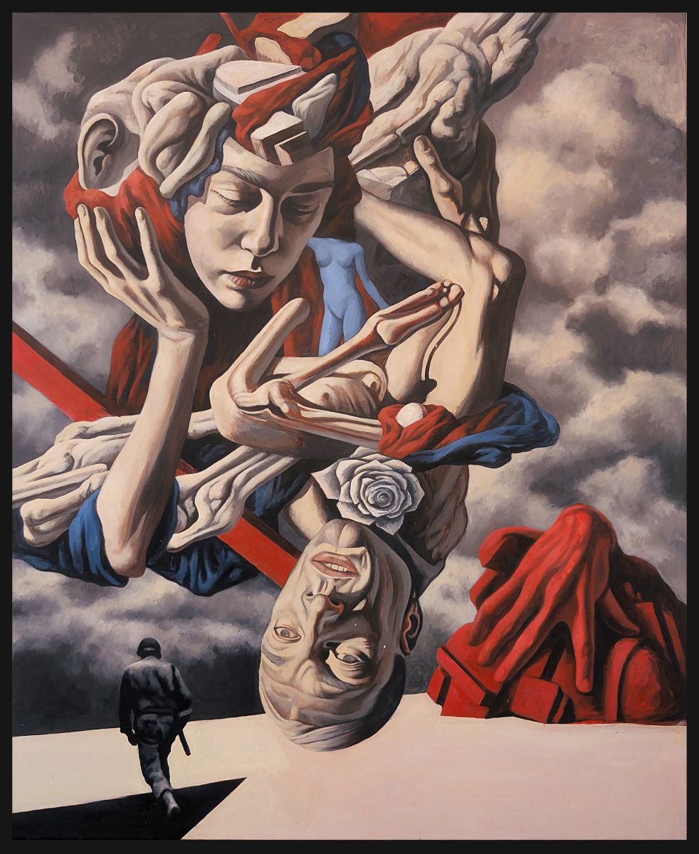 In ”Entangled”, il corpo umano cessa di essere un’entità organica e unitaria per trasformarsi in un campo di forze, un nodo di tensioni in cui si dissolvono i confini tra soggetto e struttura, tra identità e potere. La pittura diviene il luogo di una scomposizione visiva e concettuale in cui la figura umana, pur conservando una solida impostazione anatomica, viene smembrata, riassemblata e sospesa in una dimensione instabile.