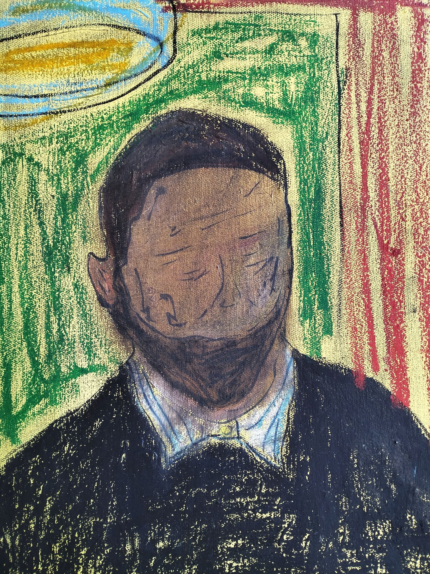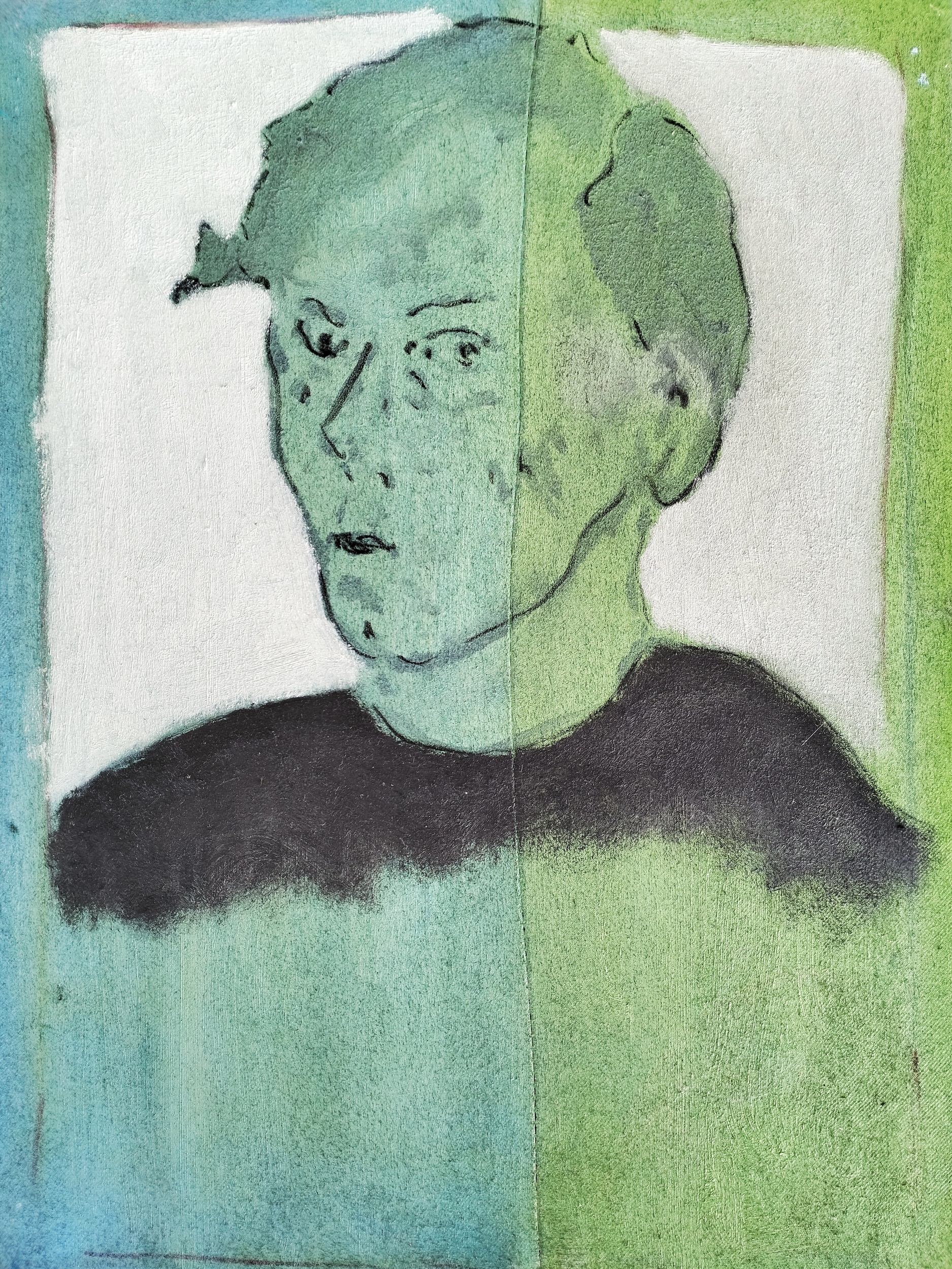 Il ritratto di una donna, dall’espressione decisa, si staglia sul fondo azzurro-verde di quella che sembrerebbe essere stata qualcosa di simile ad una mappa bipartita, solcata da una cucitura netta che divide il piano a metà, da lato a lato: acqua-terra, qua/là, sx/dx. Quel confine, limes visibile, solco di superficie, pare come evocare la sostanziale disparità e prossimità che intercorre tra rappresentazione e realtà, sembiante/fonte, materialità e icona. In questo senso va letta la ragione del titolo: “Fuori dal quadro il quadro non esiste se non come citazione”, come a dire che un quadro, una volta incarnatosi in una foggia-colore sostanziale, oltreché nello spazio di confine areale, esiste anche, quale citazione dichiarativa del quadro stesso, del suo portato profondo, non più rispondente al fenomeno-immagine da cui scaturì, ma solo attinente a sé stessa, alla sua propria entità, concreta e letterale.