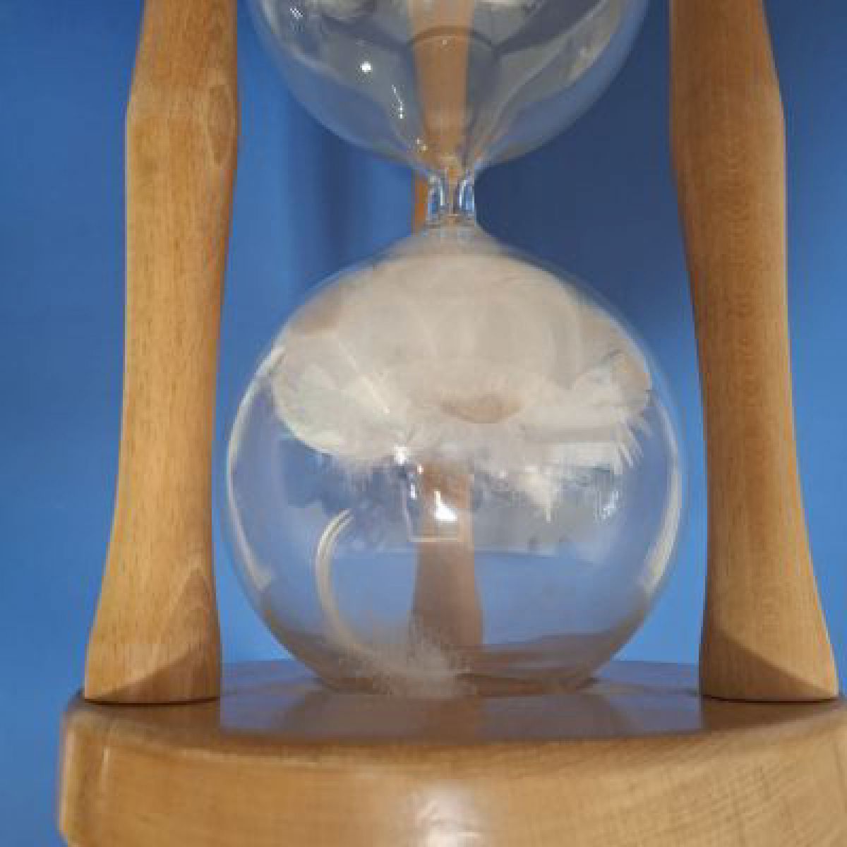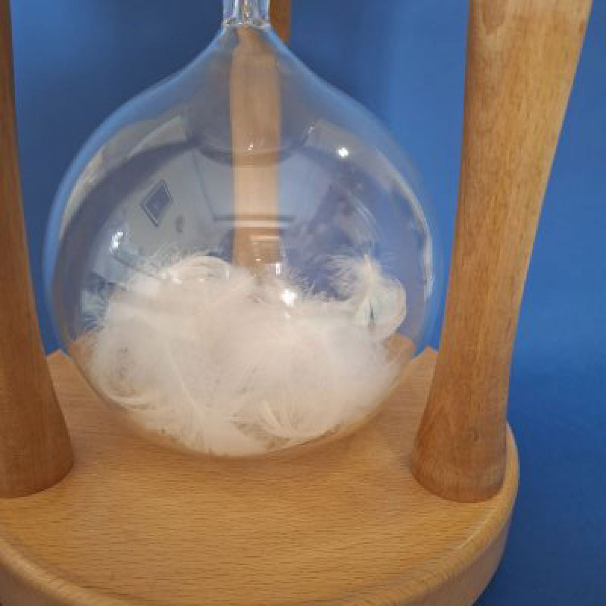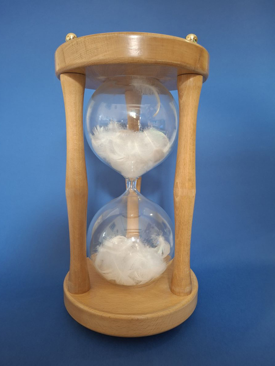 Si tratta di una clessidra che, al posto della sabbia, in entrambe le ampolle ha delle piume d’oca. Sembra che il tempo quindi non passi (perché le piume sono ferme) ma in realtà è già passato: come un uccello che si cerca di afferrare sfugge e lascia tra le dita solo un pugno di piume, così il tempo, se uno cerca di organizzarlo (o anche solo di misurarlo) fugge via, lasciando solo un pugno di ricordi.