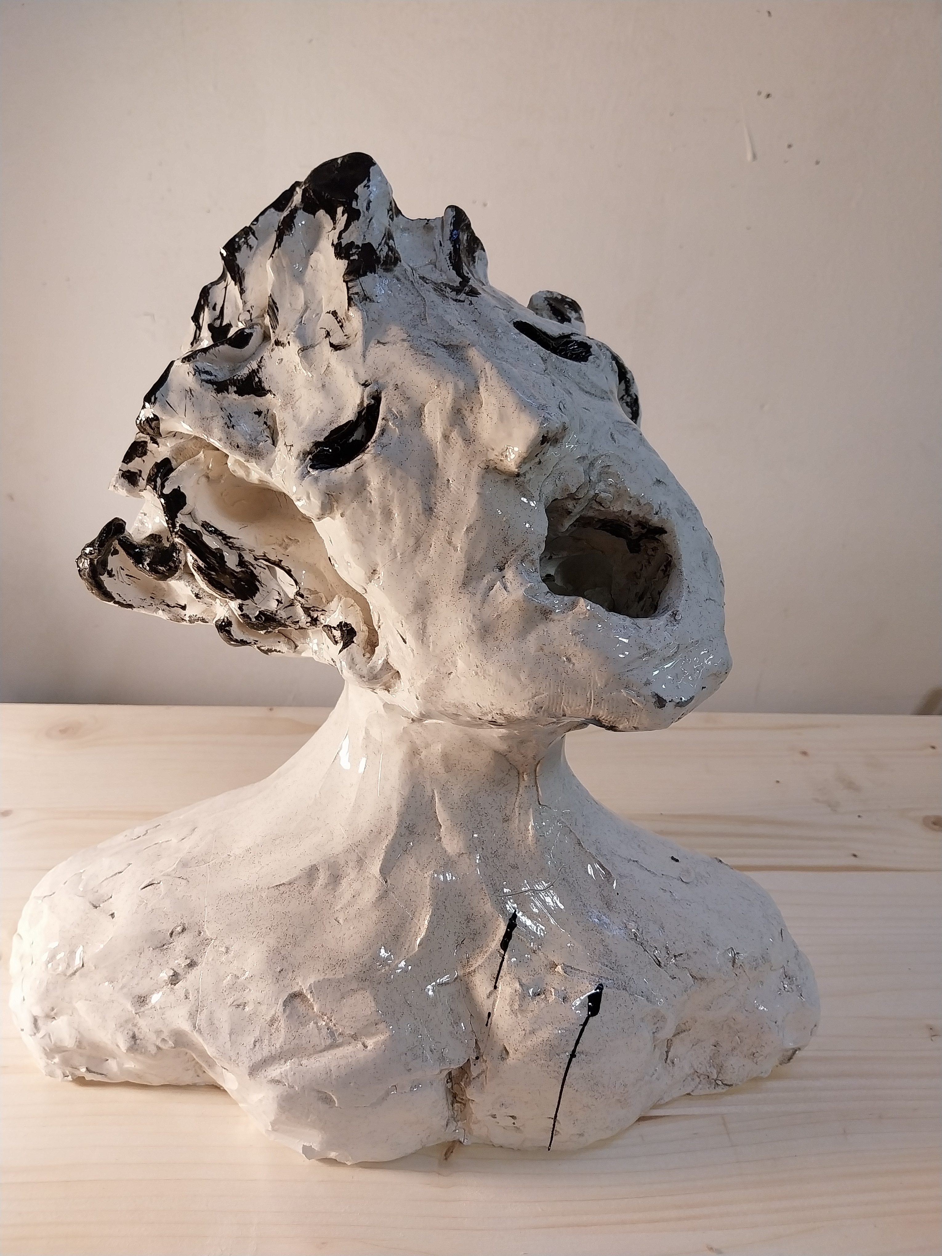 Da una serie di sculture su volti di donna spaccati, alcuni involontariamente, altri, come questo, con un colpo di martello in bocca. La violenza, al contrario delle lacrime che comporta (qui in nero) lascia tracce indelebili, nero su bianco. Sono autodidatta, lo divenni nel 2017 in Germania, a quasi 50 anni, curando un easurimento nervoso in ospedale, quando nelle sessioni di ergoterapia mi misero davanti 50 kg di argilla. Da allora non sono tornata indietro, quindi la mia biografia comincia da lì. Dalle mani, che vanno da sole.
