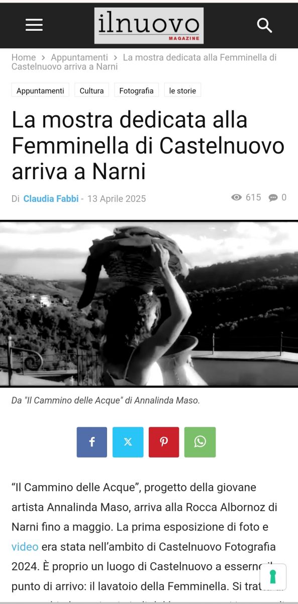 Il filo della narrazione corre lungo i sentieri percorsi a piedi, una mappatura del territorio che attraversa le varie trasformazioni del paesaggio, per confluire al lavatoio la Femminella, genius loci di un passato ancora vivo nella memoria collettiva di chi è nato prima degli anni Quaranta, quando le donne percorrevano sentieri scoscesi per lavare i panni e attingere l’acqua. Il cuore del progetto è nell’azione “Camminare come attività artistica”, in cui traccio, con il mio cammino, il percorso che le donne facevano per andare al lavatoio sotto il peso dei panni: i loro sforzi, le loro paure per l’isolamento del luogo, le loro emozioni.