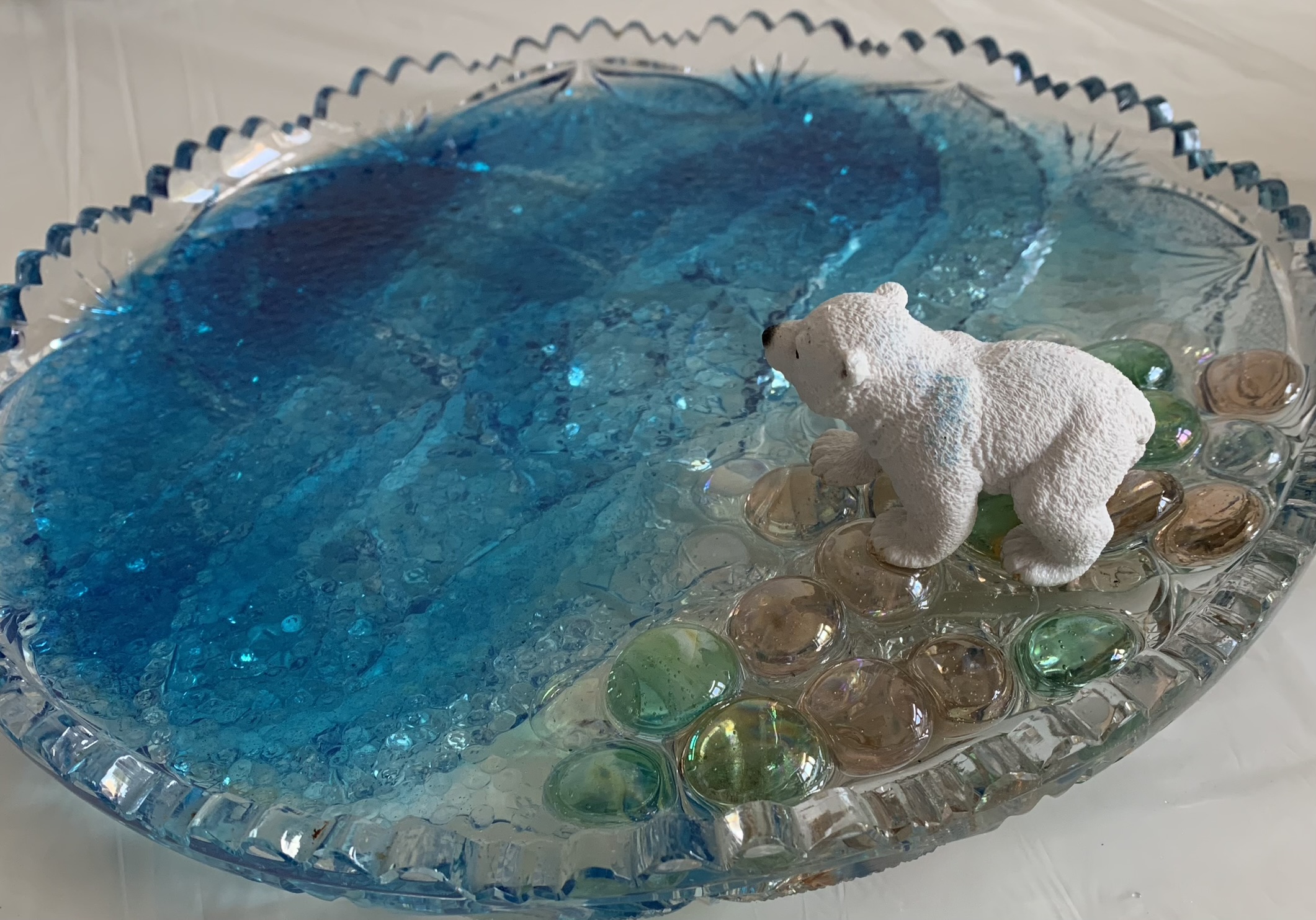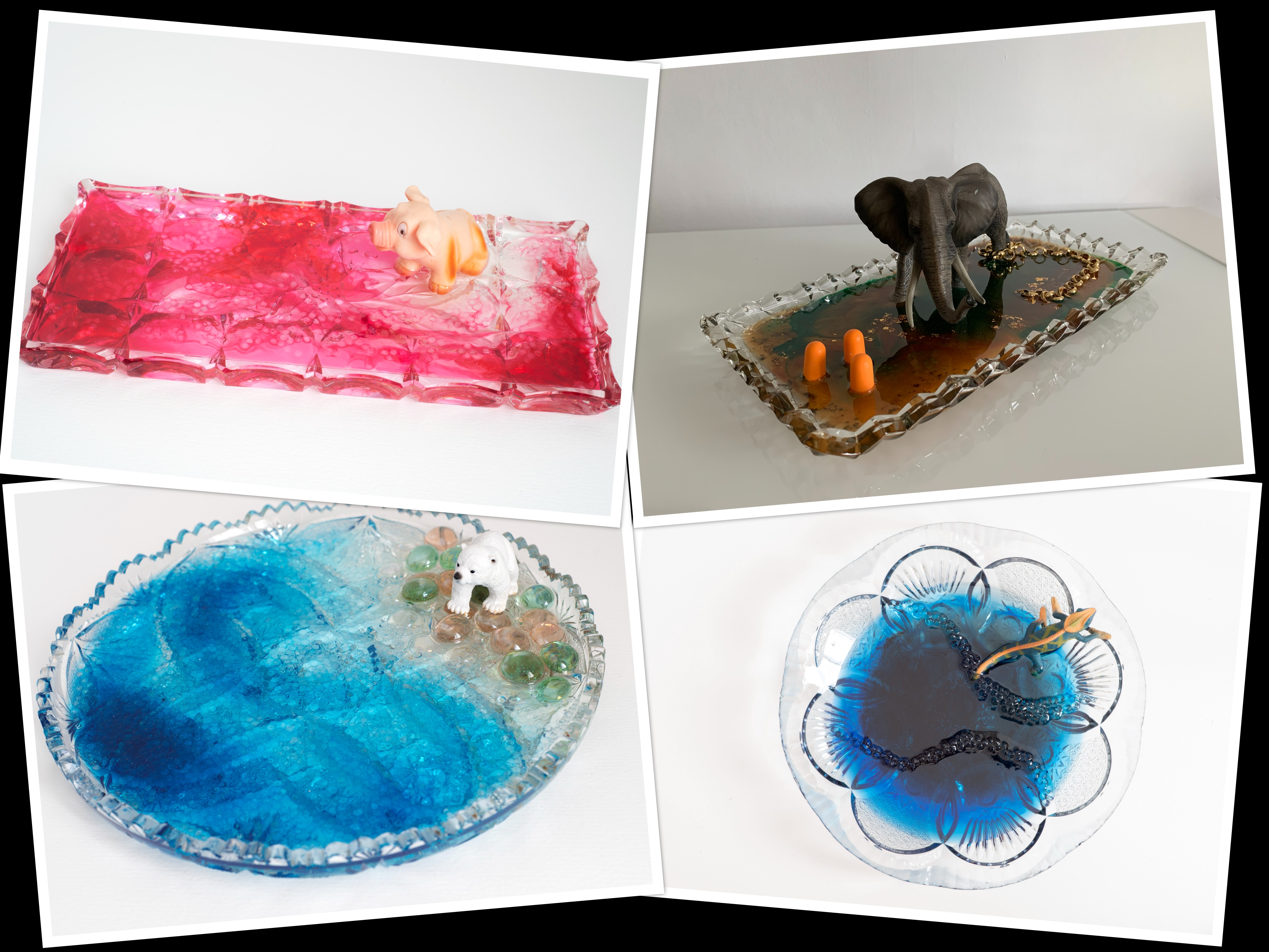 Si tratta di una installazione composta da quattro piccoli oggetti tridimensionali di dimensioni di circa 15x35x25 cm ogniuno. Ogni oggetto rappresenta una storia ambientata nello scenario di vecchi piatti di cristallo di Bohemia che ho recuperato nei mercatini delle pulci a Praga, corredati con figurine in gomma o plastica ache ho riciclato e legati da un composto di pigmenti in resina atossica. Con una narrazione semplice ed immediata, le storie ci parlano di problemi ecologici che impattano il nostro ambiente, gli animali , ed indirettamente, la nostra vita su questa terra.