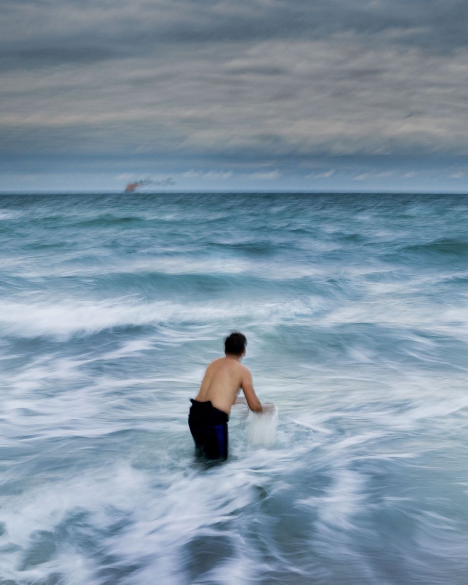 Fotografia realizzata durante una mareggiata alla playa, nota spiaggia di Catania. Un uomo raccoglie dell’acqua di mare con un bidone mentre all’orizzonte una nave prende fuoco. L’acqua marina viene portata ai ristoranti per bagnare il pesce in esposizione. La solitudine, la necessità di lavorare, induce l’uomo ad affrontare anche il mare in tempesta pur di guadagnare qualche euro. Questa esigenza si affianca con l’emergenza all’orizzonte, dove altri uomini sono in pericolo su una nave che va a fuoco.