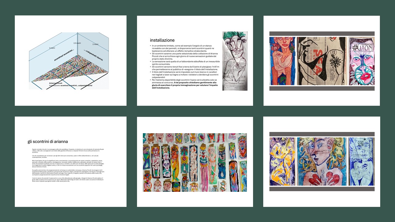 Gli scontrini saranno una parte selezionata della collezione di Arianna Piccoli che si arricchisce ogni giorno di nuove sensazioni guidate dal proprio stato d’animo. La sensazione sarà quella di un’abbondante abbuffata di un inesauribile spirito consumista.