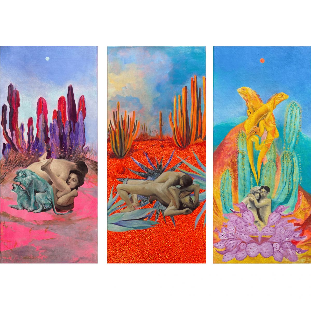 Trittico polinarrativo raffigurante tre scene ironico-riflessive, sviluppate all’interno di un’ambientazione onirico-naturalista.