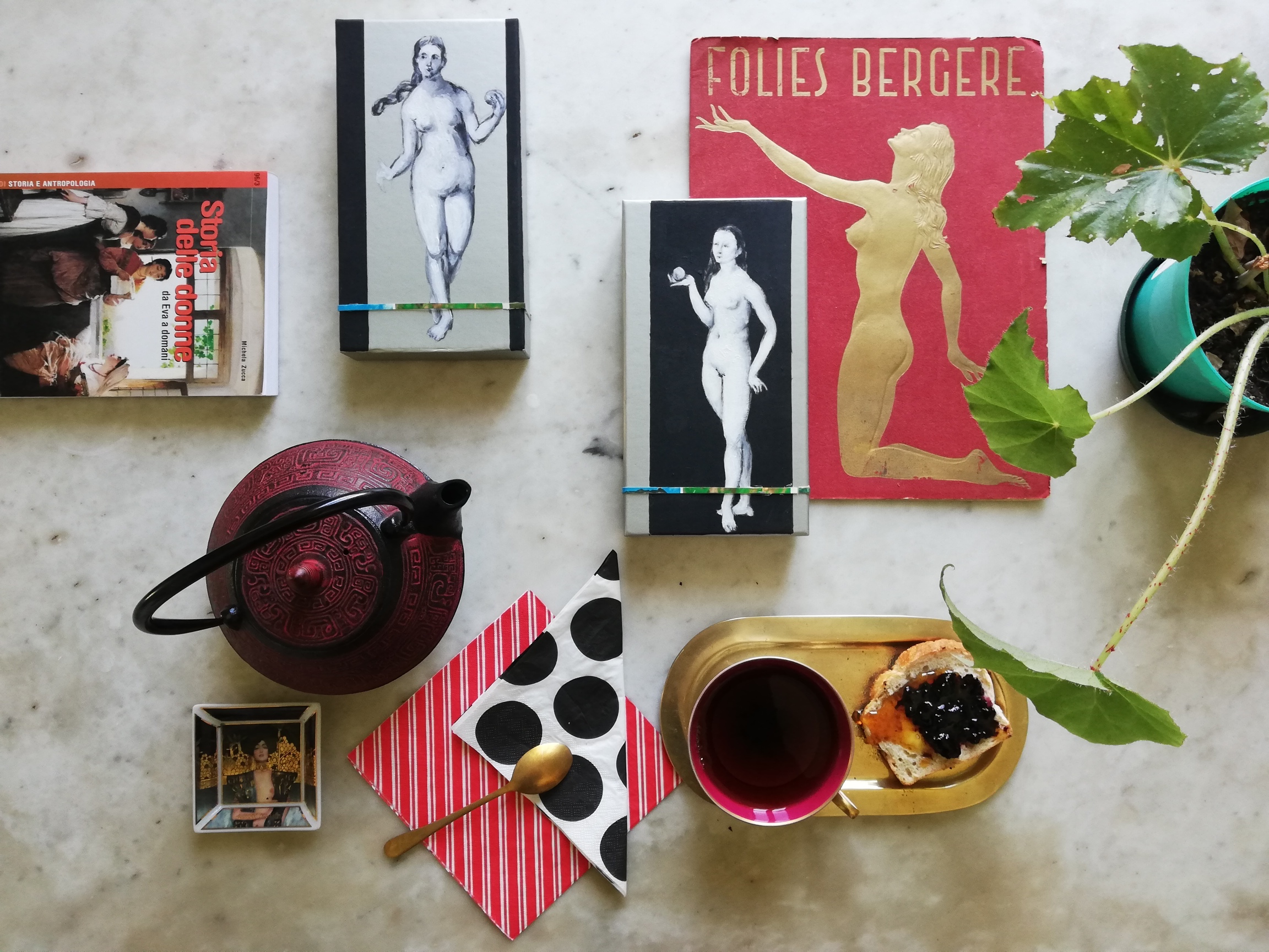 Fiori e piante, recisi o invasati, popolano a tratti un territorio, elementi naturali accanto composite “nature morte”: una collezione di multiformi ceramiche, vetri, libri, taccuini, carte, stoffe, manufatti che accompagnano, celebrandoli, i cibi del primo pasto. Uova, pane tostato, burro, tahin, confetture, frutta e rigorosamente tè, bevanda benefica e meditativa.