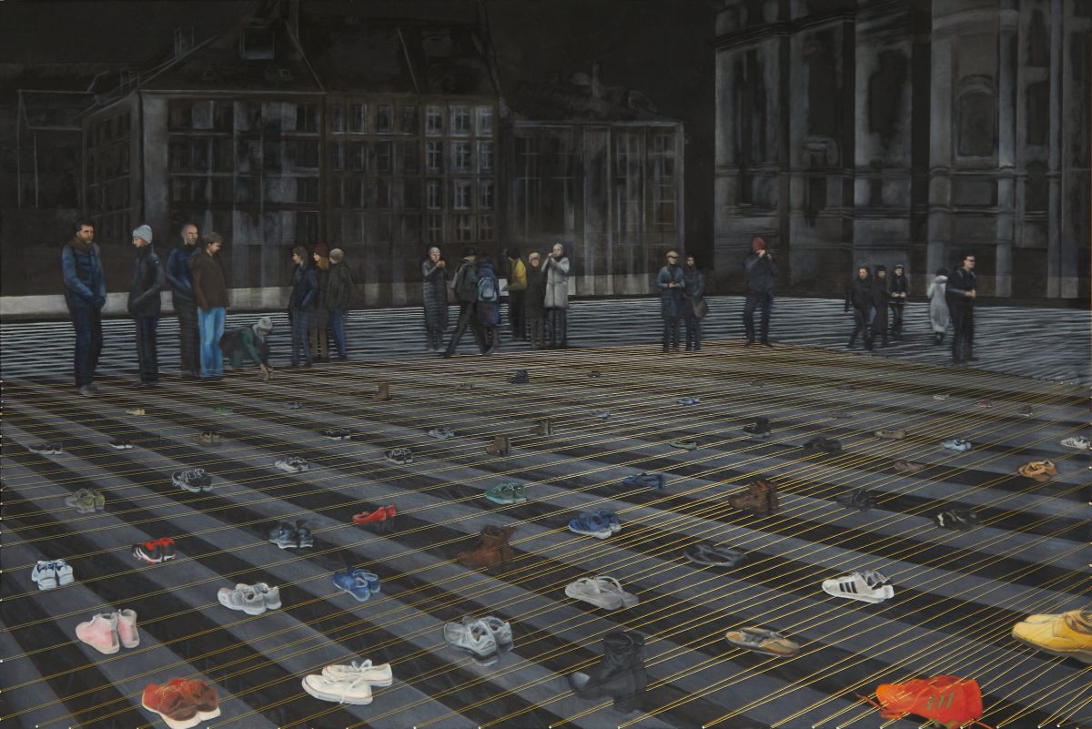 La técnica utilizada es pintura al óleo sobre lienzo. Para resaltar la zona de la plaza que honra a las víctimas he colocado alambre dorado que posteriormente he pintado con acrílico en las zonas que coinciden con los zapatos.
