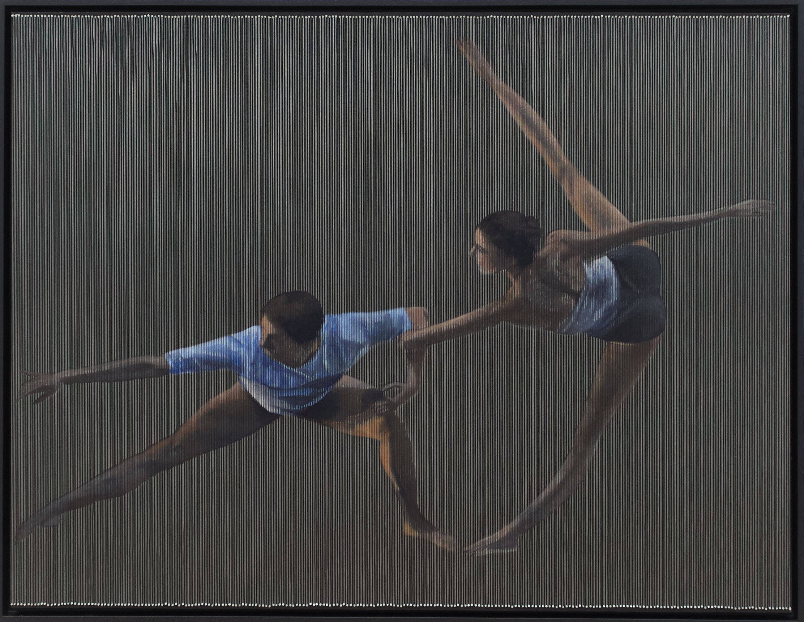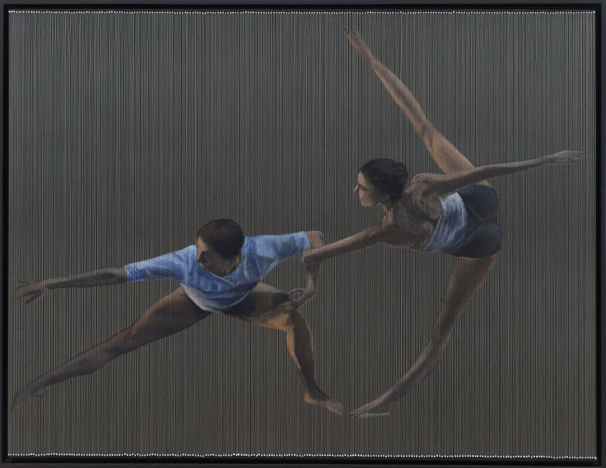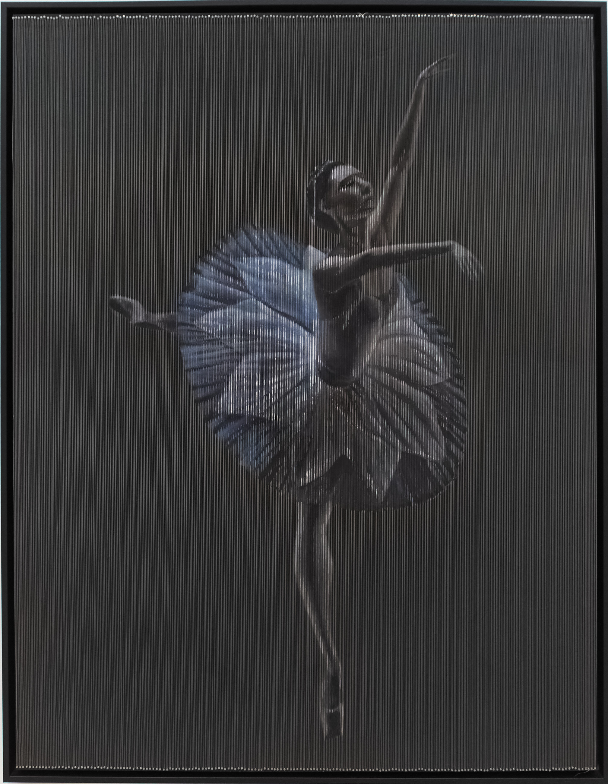 He escogido el alambre a modo de cuerdas de piano para resaltar la musicalidad que acompaña a los bailarines y añadir, a su vez, profundidad a la figura. Se puede ver cómo la luz se refleja en cada una de las hebras del alambre creando juegos de luz y sombras a su alrededor. Son como pistas para entender el cuadro en varias dimensiones.
