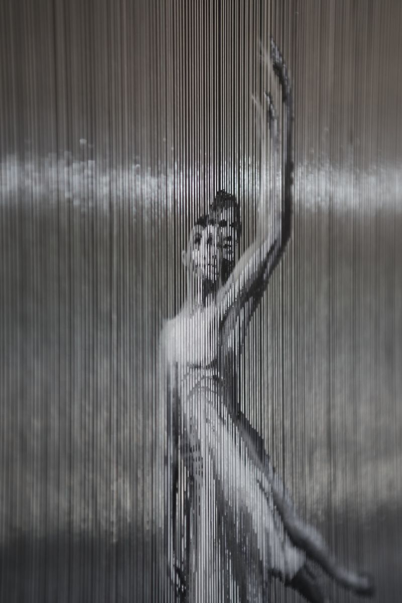 El alambre que las cubre expresa tensión a la vez que le aporta volumen. Juega con esa doble capa que invita al espectador a terminar el puzzle de la imagen recreando lo que hay detrás. Estas bailarinas expresan la belleza de la tensión de la danza y de la música de fondo.