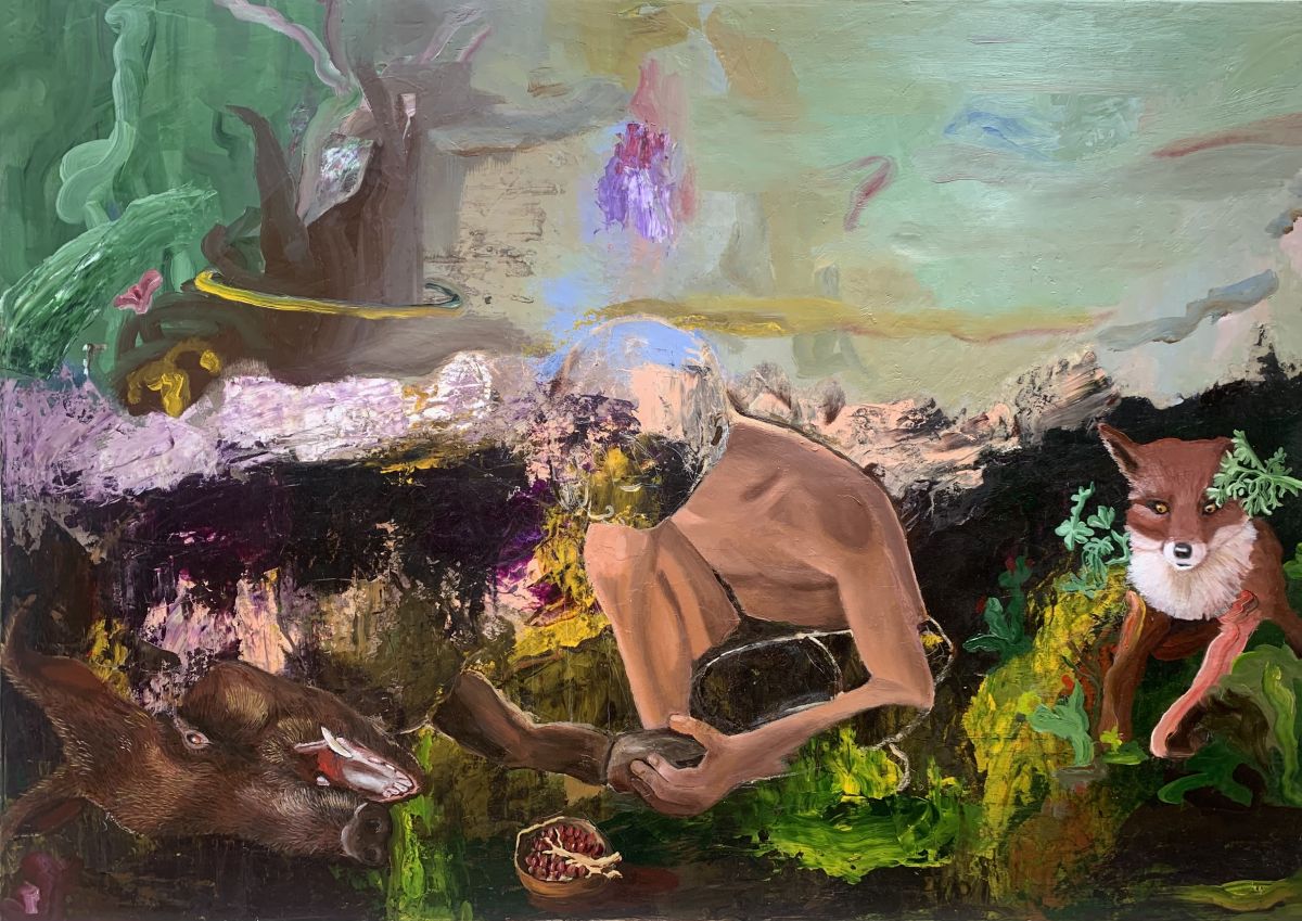 However, in my painting, only her sorrow is evident, as her protection was not enough to save the boar from human cruelty.