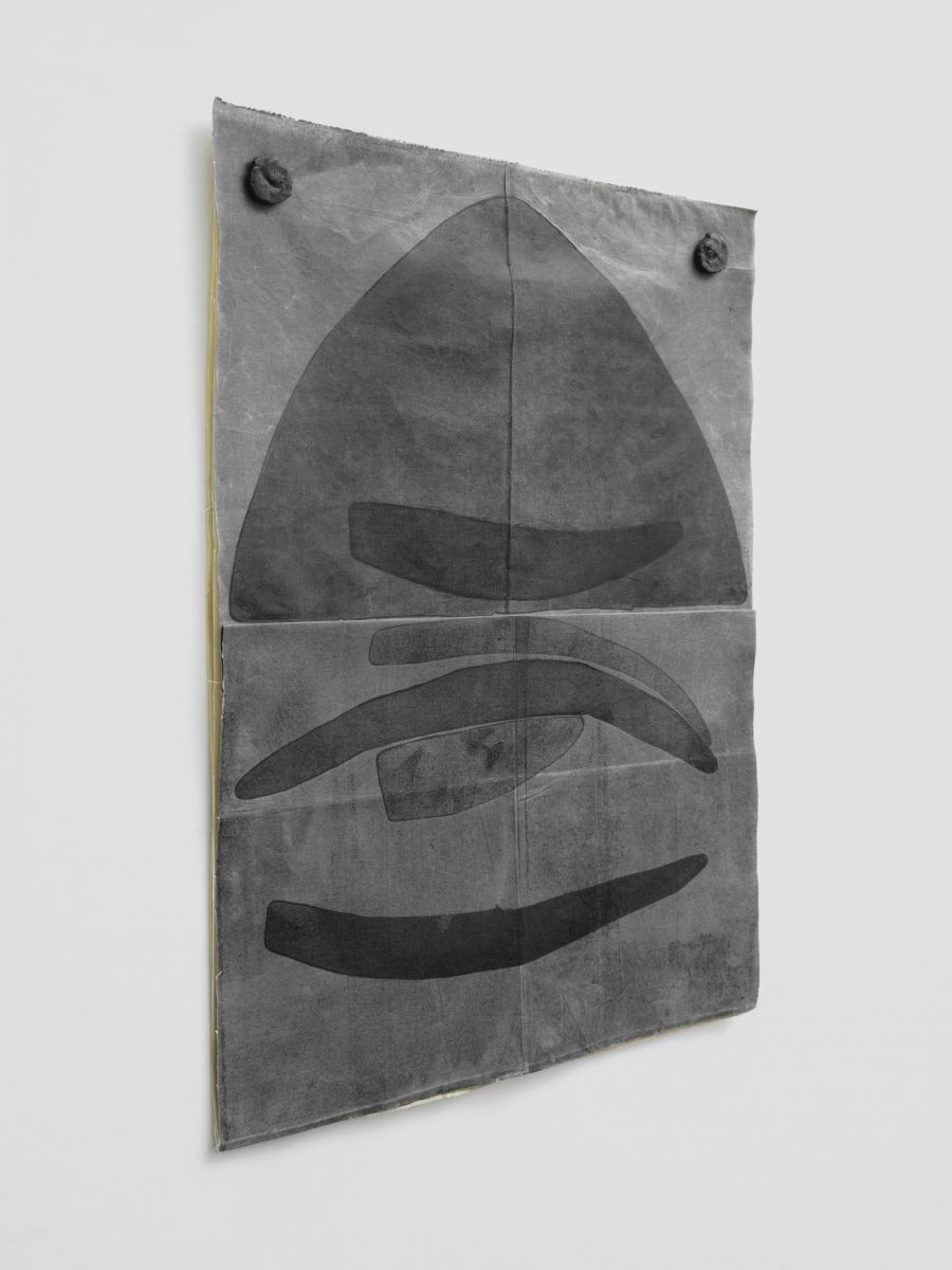L’opera grafica è composta da tele di cotone addizionate con cera d’api, sulle quali sono stampate a torchio una serie di matrici in piombo sagomate e incise a puntasecca e pasta acrilica. La disposizione dei frammenti di metallo sul supporto non è casuale, ma intesa a suggerire forme archetipiche, simboli e icone di una spiritualità pagana appartenenti a un’epoca remota e indefinita, che si pongono in dialogo formale con lo spazio espositivo della Fondazione. Questo rapporto con l’arcaico si ritrova nel processo stesso di preparazione della tela, dove l’imprimitura, solitamente impiegata per garantire l’inalterabilità del supporto, assume un significato opposto: la cera lavorata a mano è destinata a mutare sotto l’azione dell’aria e degli agenti, trasformando il suo aspetto nel tempo in una continua tensione verso un divenire altro. L’accostamento tra materiali organici e inorganici, come il piombo e la cera, diventa quindi il mezzo attraverso cui avviene l’indagine tra permanenza e mutamento, tra atto e potenza, dando vita a un’opera che si pone nel crocevia tra l’essere e il divenire.