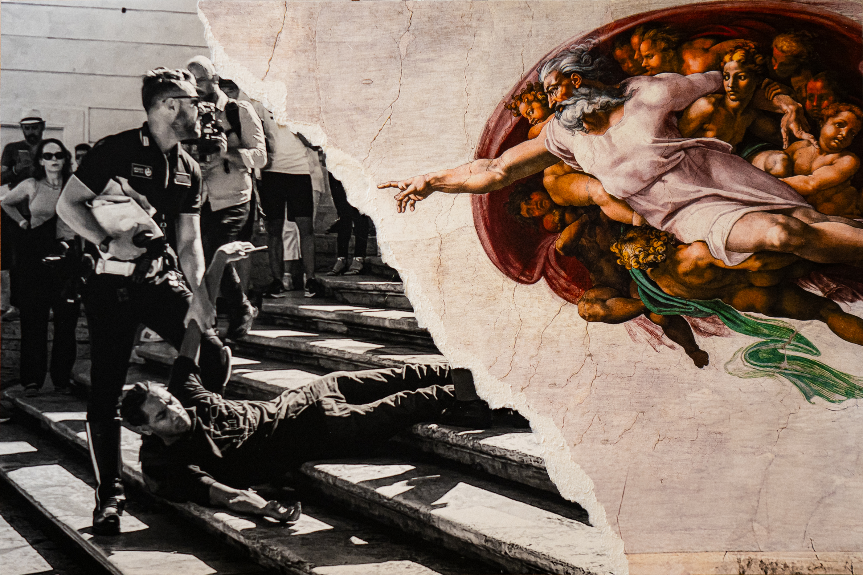 La fotografia mostra un uomo steso per terra, cancellato dal mondo non solo dallo sguardo delle persone, ma anche fisicamente: il suo volto è stato abraso con carta vetrata, simbolo visivo dell’annientamento dell’identità.