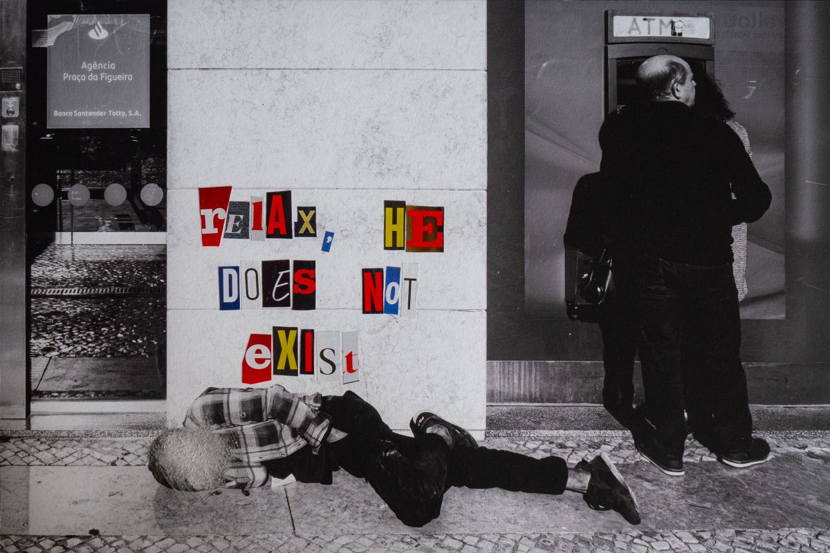 Sopra di lui, sul muro, una frase composta con lettere ritagliate da giornali ripete con tono rassicurante e beffardo ciò che la società preferisce credere: che chi soffre, chi è caduto, chi non ha più nulla… semplicemente non esiste.