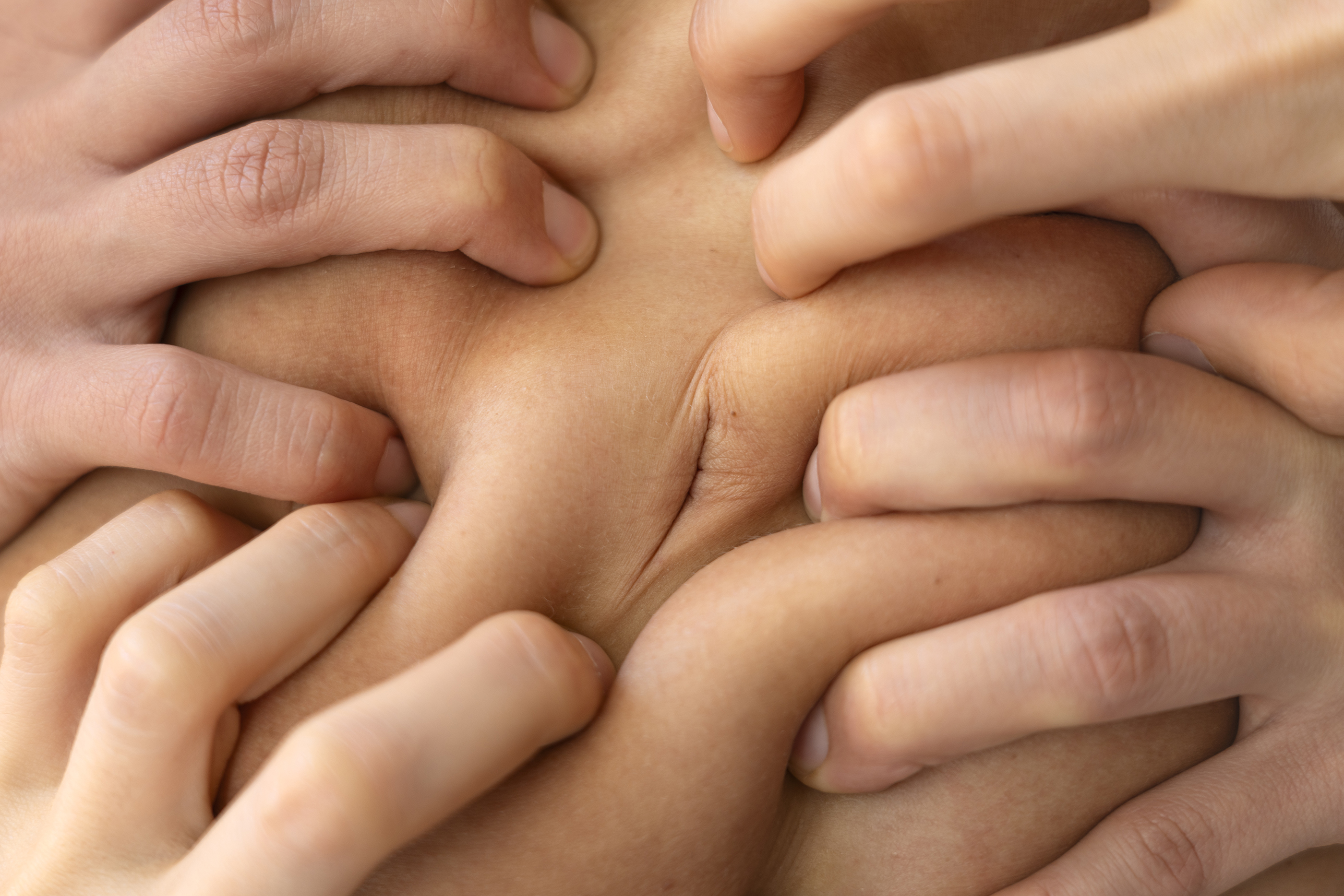 Le mani — presenti in tutti gli scatti — sfiorano il ventre, lo accarezzano, lo pizzicano, lo stringono, giocano con la carne, appaiono e spariscono, stringono, fanno male. Quelle mani bloccano il corpo e la mente, la immobilizzano, la soffocano ma non lasciano apparentemente segni.