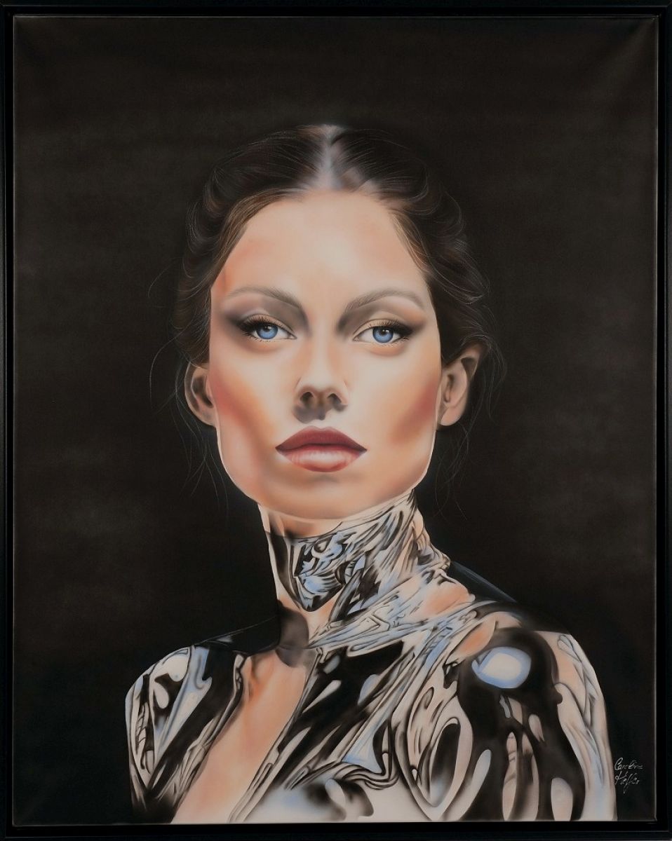 This imaginative female portrait radiates strength and inner calm. The green floral patterns symbolize a deep connection with nature and personal growth. Created with the airbrush technique, the artwork has a soft, almost glowing appearance that conveys both energy and harmony. Caroline Helfer is a Swiss artist working primarily with airbrush, mixed media, and sculpture. Her works explore themes of human connection, emotional depth, and nature. After a life-changing accident, art became her most powerful form of expression and healing. She has exhibited in various group shows and continues to inspire through deeply personal yet universal artworks.