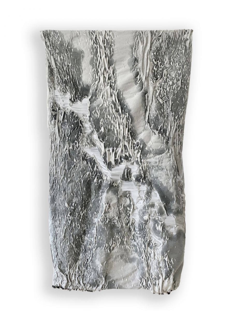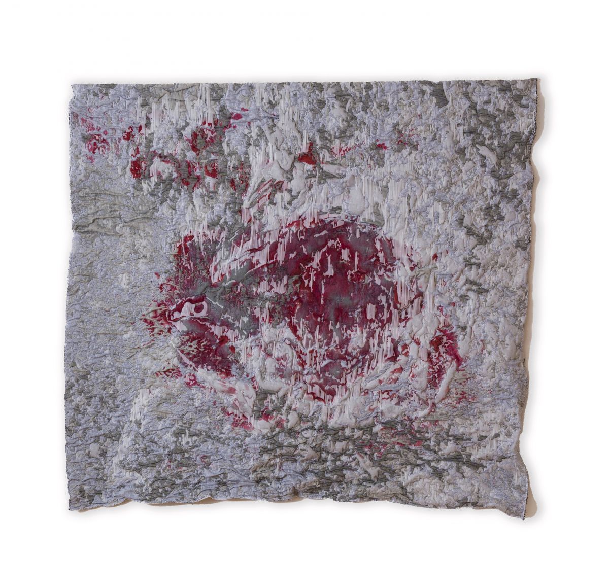 opera realizzata mediante tessitura jacquard tridimensionale in filato flott� trayma. la struttura � successivamente consolidata con resina epossidica bicomponente e rifinita con rivestimento metallico a freddo, trayma jacquard (invenzione dell’artista), resina, pittura minerale metallica
