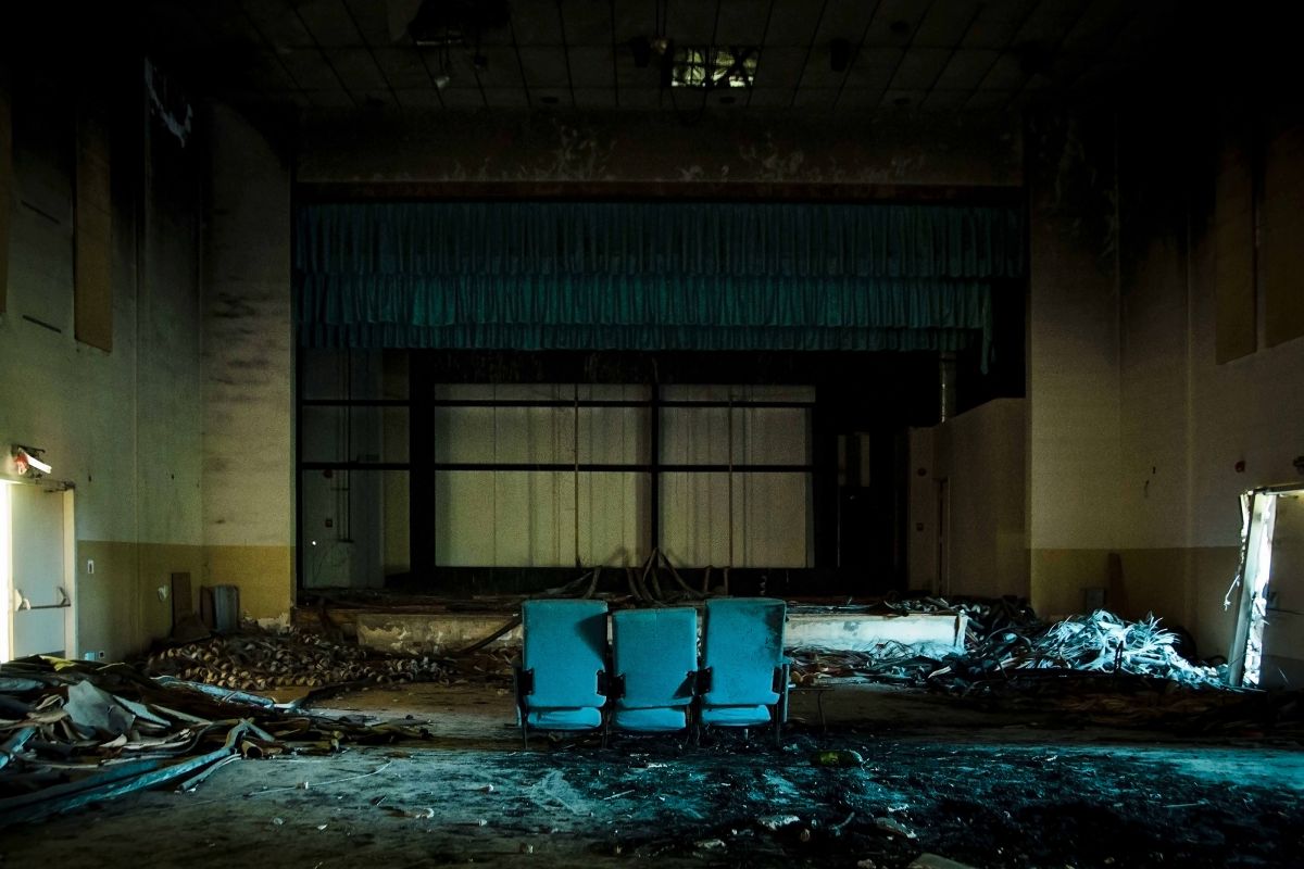 Un teatro distrutto, un palcoscenico vuoto, tre sedie al centro. Intatte.