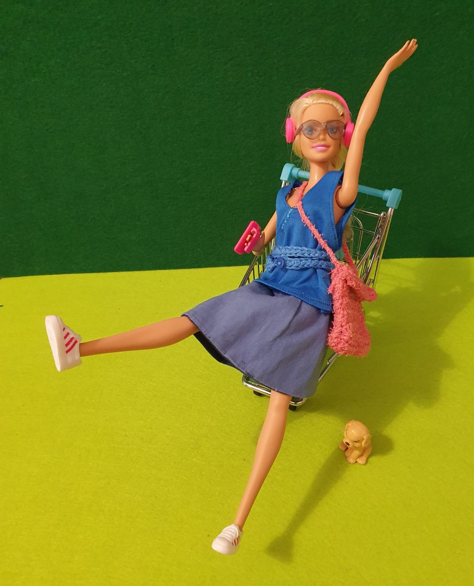 La fotografia presenta una Barbie seduta su di un carrello della spesa in miniatura, riccamente illuminata e catturata in un momento di apparente gioia e vitalità.
