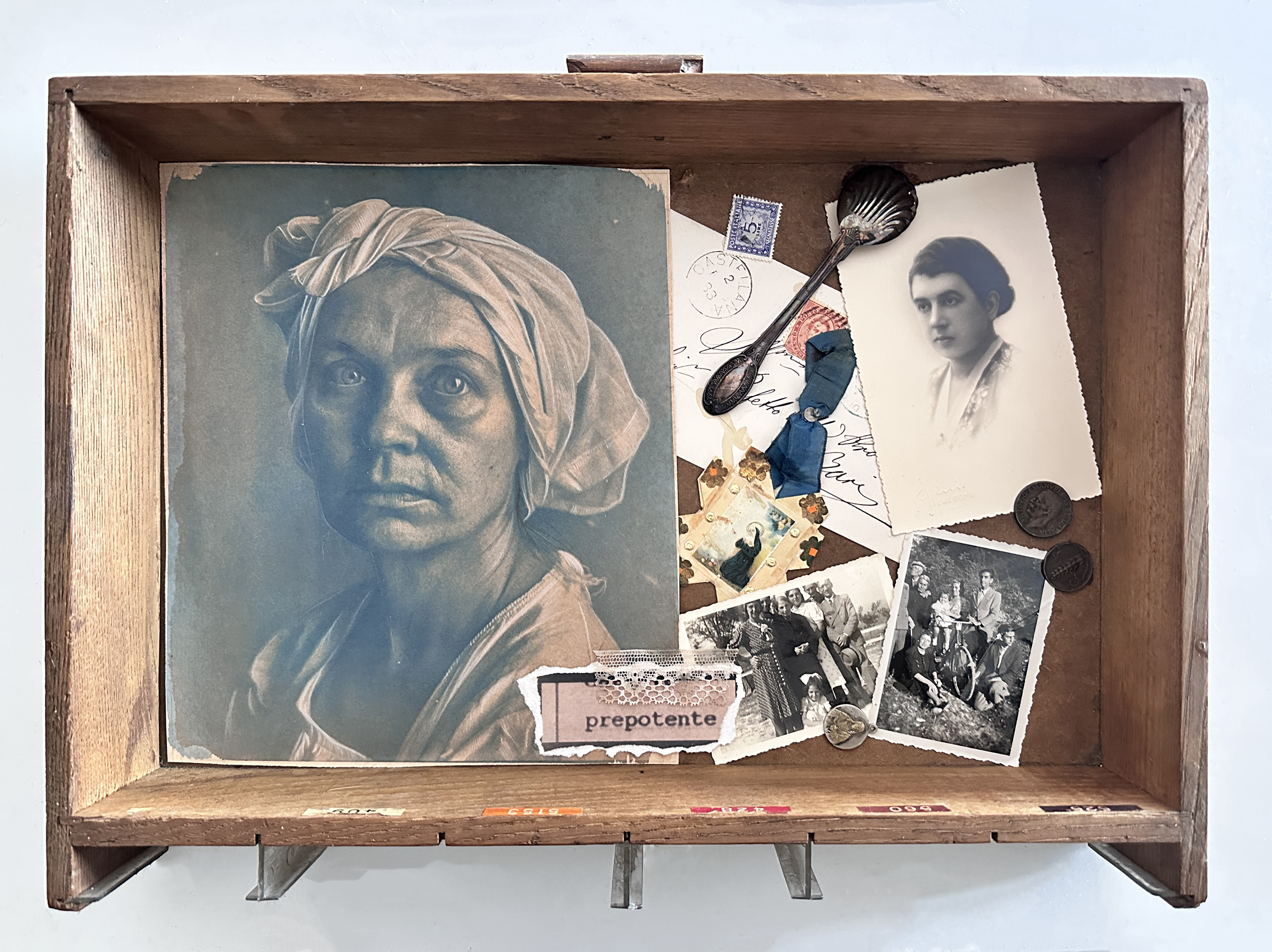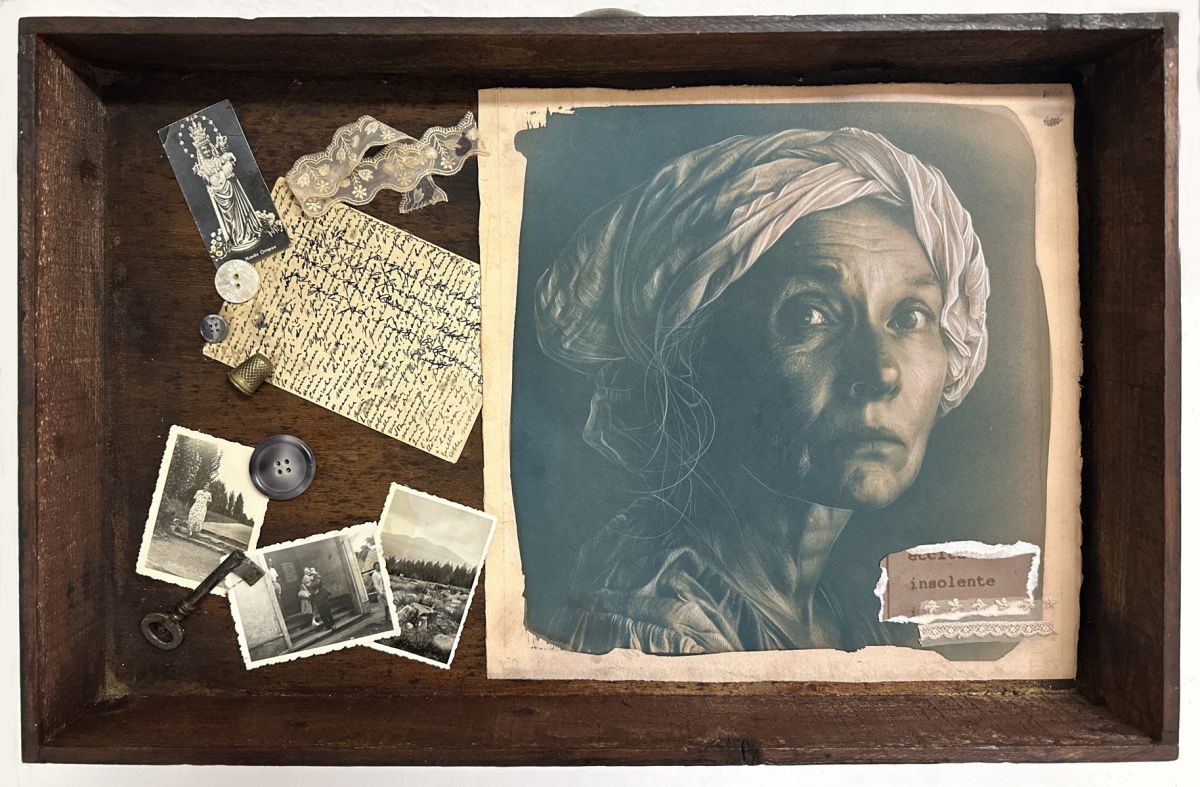 Su questi cianotipi sono poi intervenuta manualmente con matite colorate e poi inseriti in vecchi cassetti, che richiamano la memoria del loro privato, del quotidiano, del ricordo. In ogni cassetto ho aggiunto oggetti, fotografie, lettere, reliquie.Sono simboli di vite intrappolate, mai raccontate, di sogni non realizzati. Ogni elemento è pensato per creare un legame emotivo, affettivo e per narrarci e immaginarci una storia e una vita interrotta. Ad ogni volto aggiungo l’”etichetta”, presa dal diario clinico del periodo, della causa per cui furono internate, invitando lo spettatore a riflettere su quella condizione di marginalità,invisibilità e ingiustizia che molte donne hanno vissuto, facendoci anche domande su quante donne ancora oggi, in altri contesti o regioni del mondo, vivano ancora quegli stessi stigmi e situazioni di privazione della libertà di pensiero e azione.