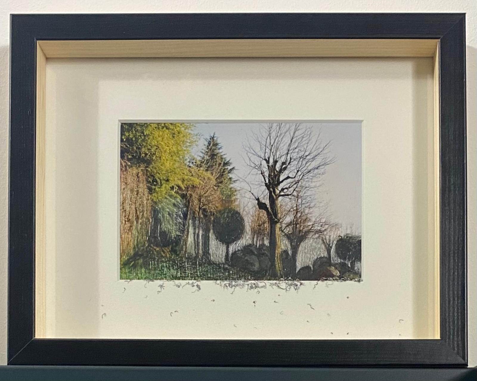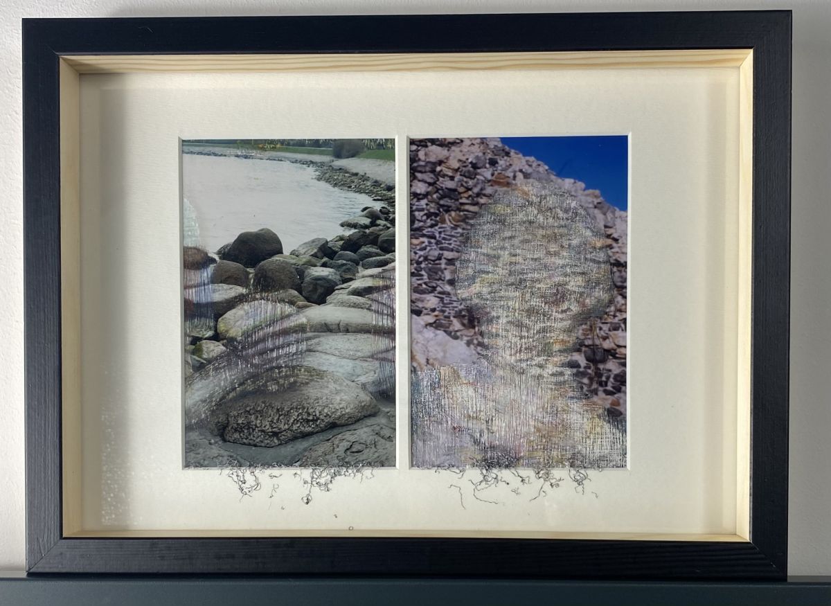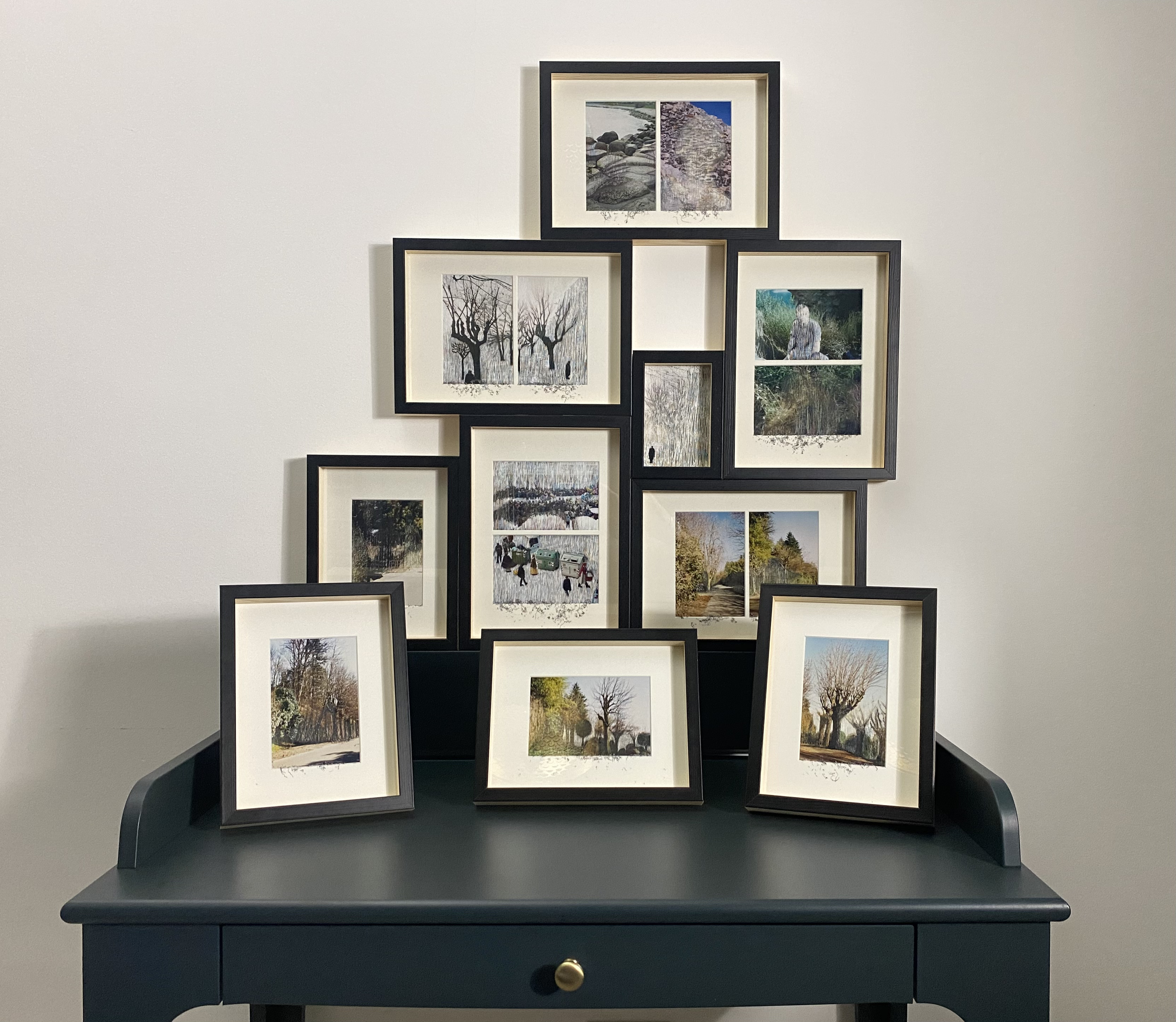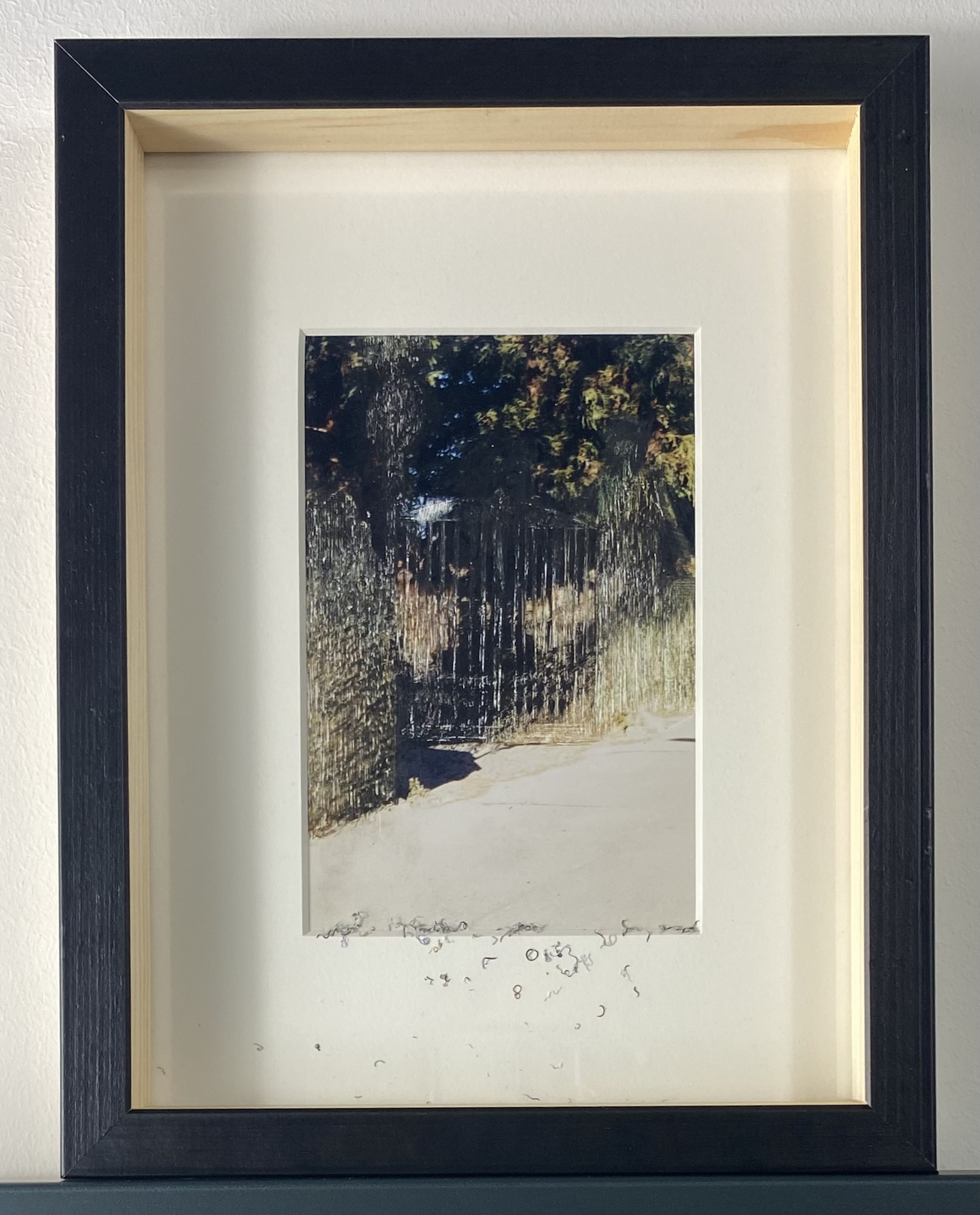 L’opera muove da un primo approccio intimo per poi ampliare respiro e intento a un contesto collettivo. Ciò si riflette sia nel tipo di immagini, fotografie scattate in diversi momenti della nostra vita, sia nel tipo di allestimento proposto fatto anche di cornici da tavolo. In entrambe le accezioni il progetto indaga il paradosso insito nel concetto stesso di memoria, intesa sia come limite che come possibilità, insistendo ancora sul processo alchemico che ne deriva e che conduce all’acquisizione di una nuova consapevolezza, alla maieutica e ai suoi due momenti necessari: pars destruens e pars costruens. Il tutto si condensa in una pratica artistica fatta di graffi incisi sulle fotografie, vere e proprie abrasioni atte a distruggere parte della composizione, per poi, in alcuni casi, ricostruirla. Questi graffi servono a rimuovere elementi naturali dal paesaggio allo scopo di creare un monito, una suggestione, un sentimento di nostalgia causato dalla perdita, e che producono una “polvere” conservata a vista nelle cornici; talvolta invece la rimozione riguarda barriere e persone percepite come intruse. Gli elementi naturali di sfondo in questo caso appaiono ricostruiti in una sorta di camouflage ispirato alla tecnica di restauro detta Rigatino: fitte righe accostate prendono il posto degli elementi visivi originali rimossi e poi ricostruiti dal gesto.