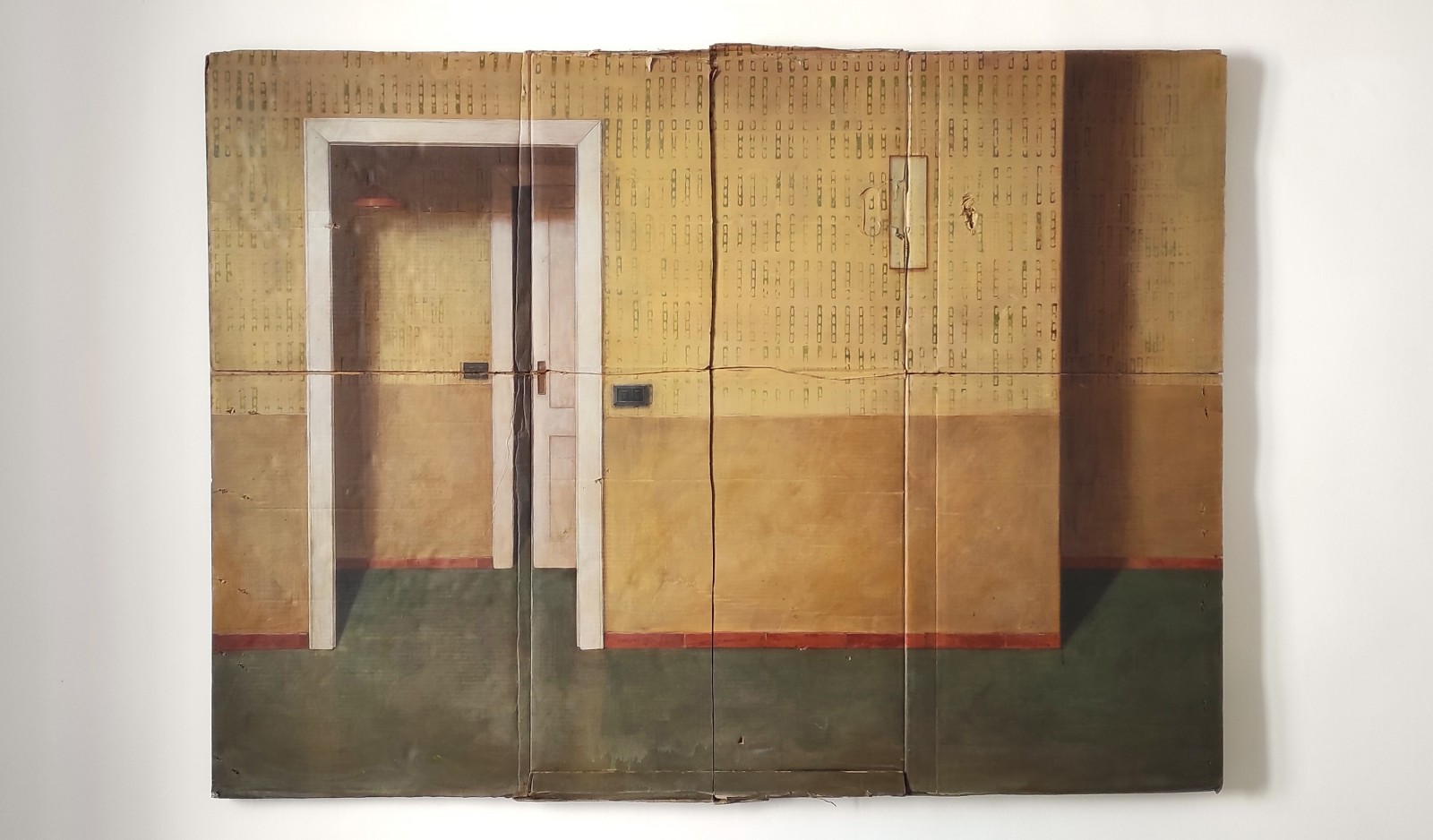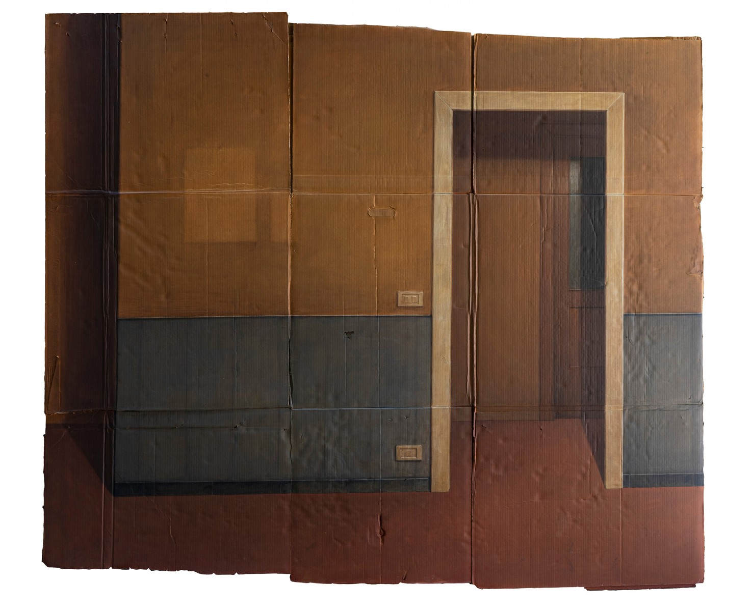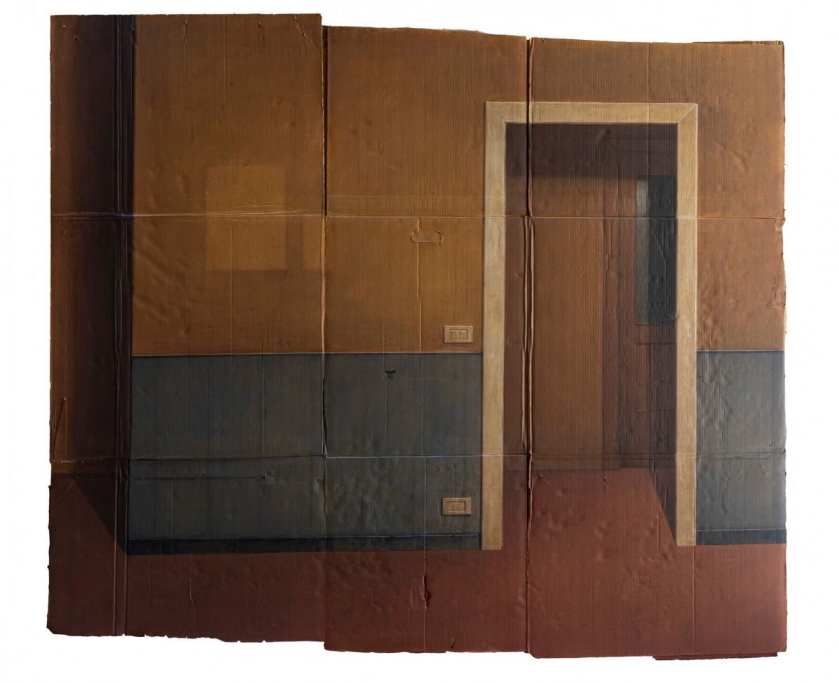 L’uso del cartone, materiale di scarto che torna qui a vivere grazie al processo di selezione e assemblaggio è integrato a pieno titolo nel processo creativo che non può quindi più prescinderne: pittura e supporto si fondono e diventano un unicum, dove l’uno non avrebbe pieno compimento senza l’altro.