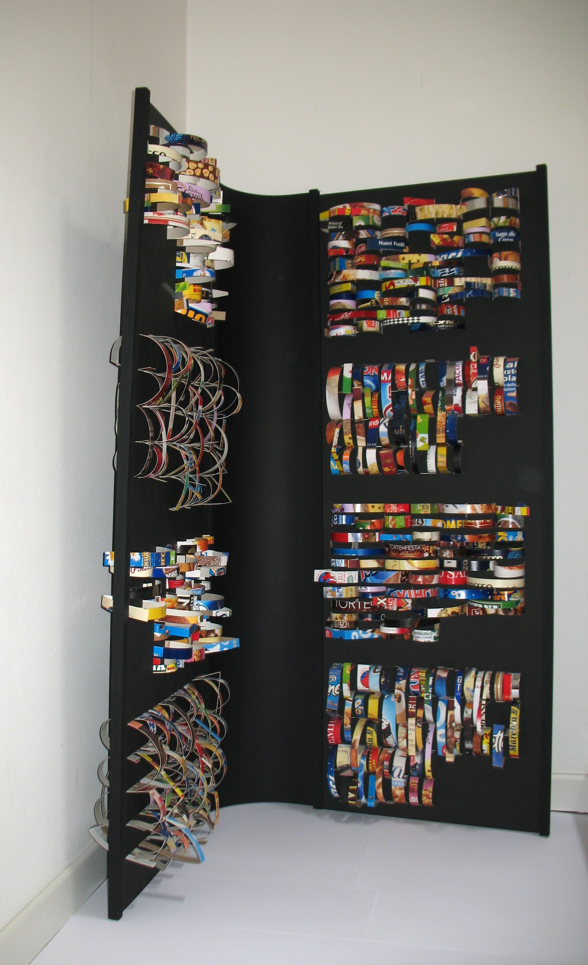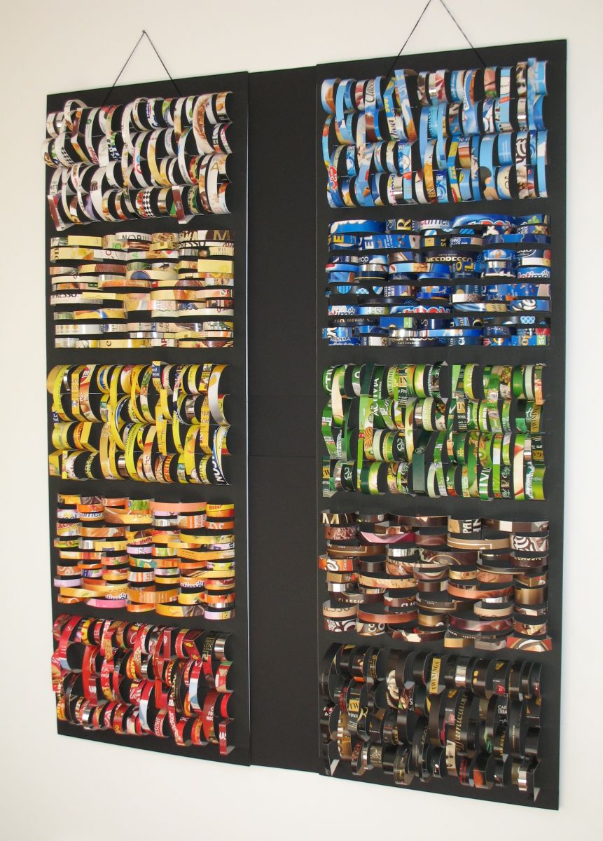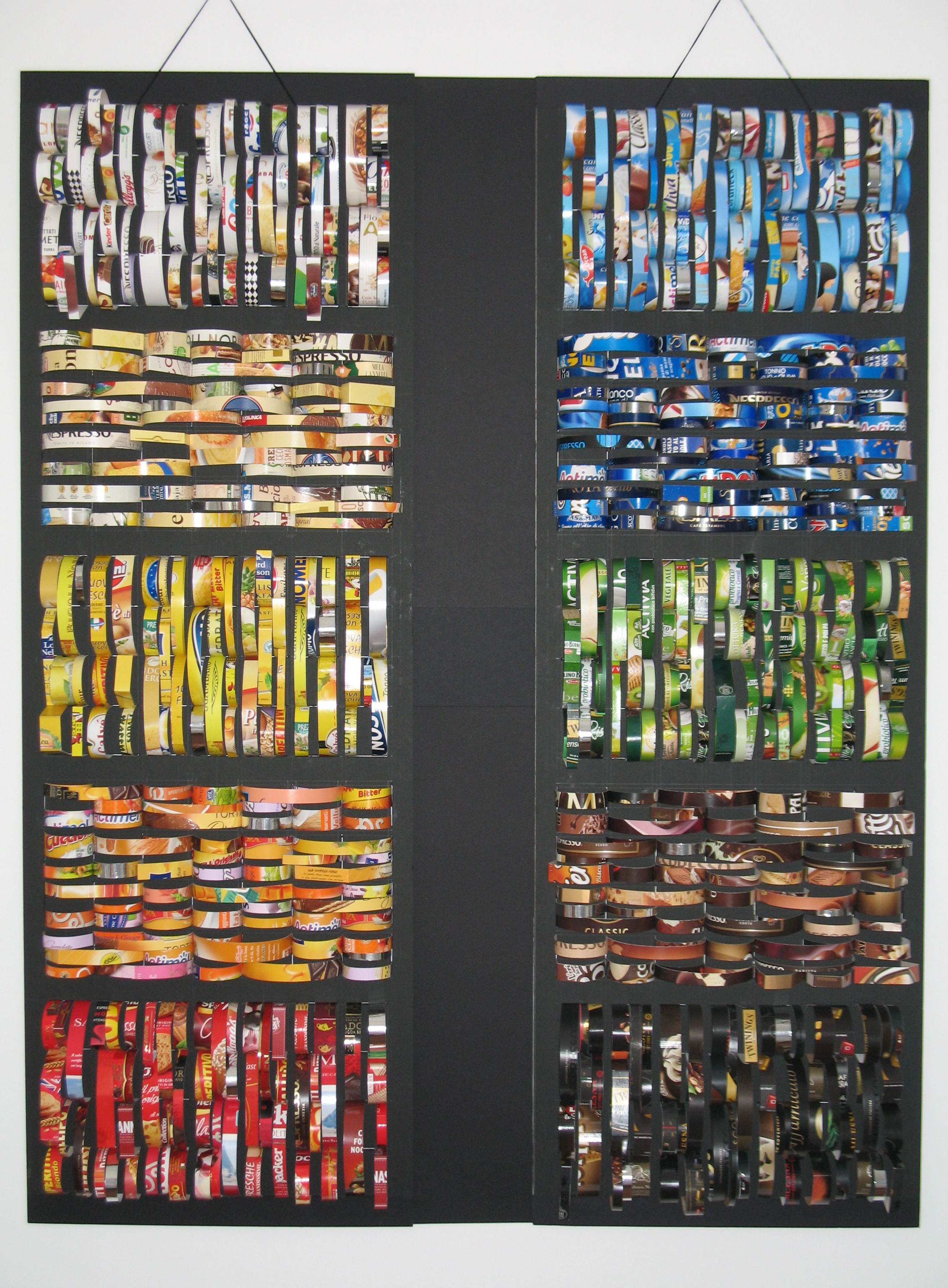 Nell’opera “Colori, Immagini, Segni, Parole…Oggi!” la tavolozza cromatica e materica attinge dall’assortimento dei packaging di generi alimentari a cui è data la possibilità di vivere in un’altra dimensione: una nuova nobilitate. Le striscette sono inserite nei due pannelli divise per “colore” in cinque campiture rettangolari ciascuno. I nomi dei prodotti, gli ingredienti, il loro utilizzo si intuiscono nelle didascalie e nelle immagini delle confezioni che vengono tagliate a striscette, perdendo in parte la loro riconoscibilità commerciale e diventando così dei segni astratti. Nel percorso visivo di chi osserva, lo sguardo può ricomporre come in un gioco le parole e risalire ai prodotti da cui derivano. L’opera ci racconta delle persone che li utilizzano e narra la storia di tutti, immersi nello stesso consumismo. Ma è anche una riflessione sulla sostenibilità ambientale, sullo spreco alimentare e sul riciclo compatibile con il difficile processo di transizione ecologica.
