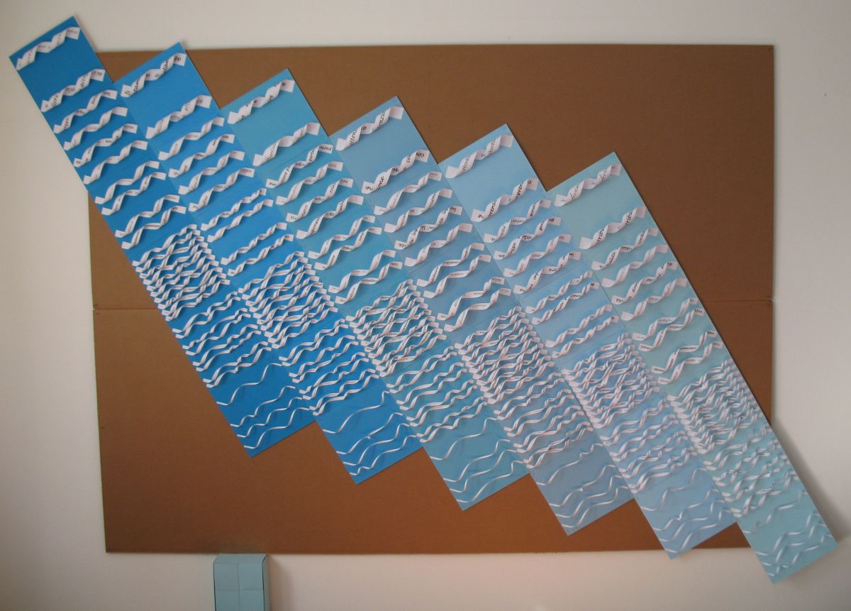 L’opera dal titolo “Colori, Immagini, Segni, Parole…Oggi!” è una composizione articolata in formato verticale eseguita su due lastre di laminil nero, spessore 0,5 cm, dalle seguenti dimensioni H 140 cm x L 48 cm x P 12 cm con l’inserimento, al centro, di un pannello nero di H 140 cm x L 14 cm. La composizione si avvale di listelli cartacei disposti in volute di varia ampiezza e inseriti in una trama di tagli, accuratamente progettati sul supporto di laminil (foglio di polistirene estruso espanso tra due fogli di cartoncino). Le striscette si aggettano dalla superficie del supporto alternandosi in verticale e in orizzontale.