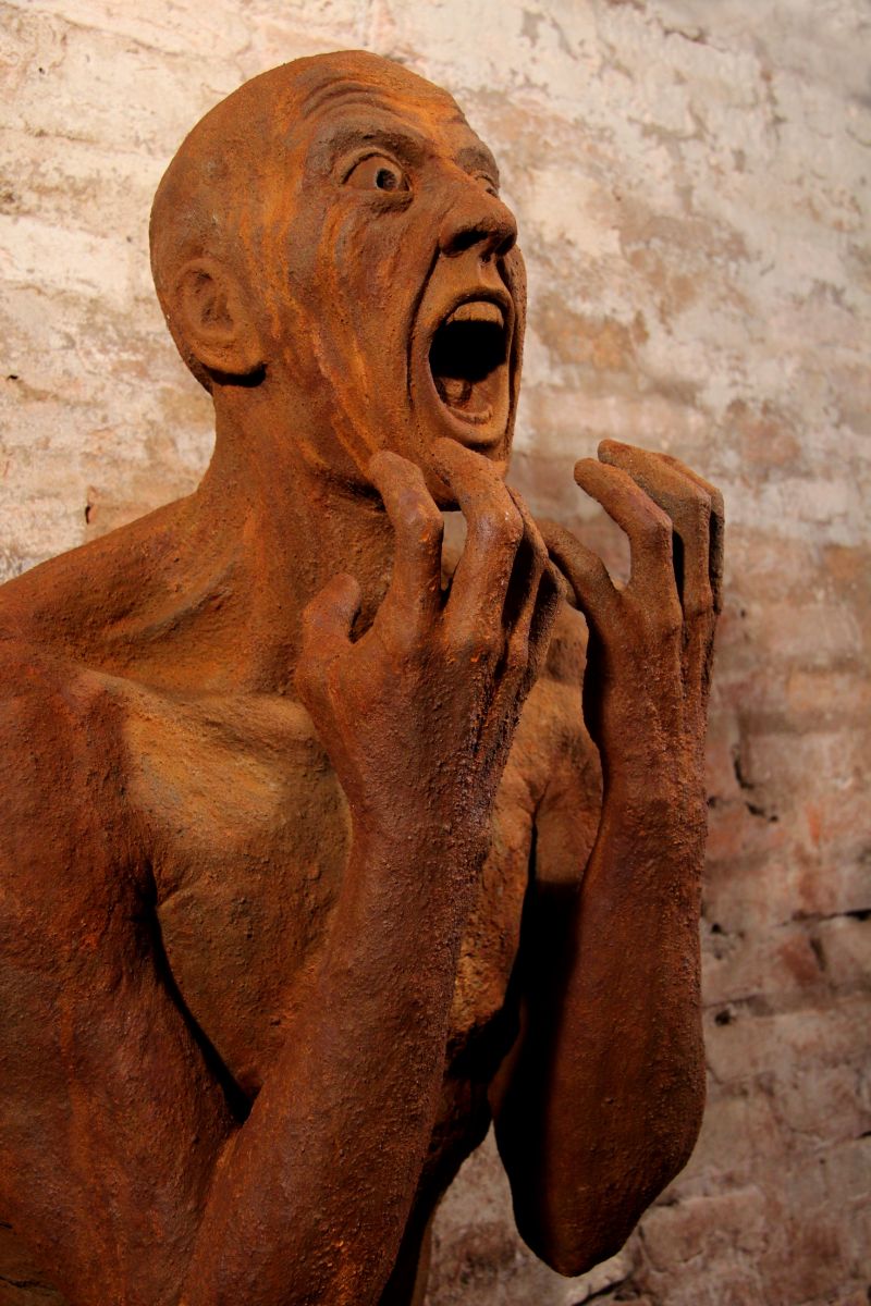 scultura a tutto tondo, gres, legno, cuoio