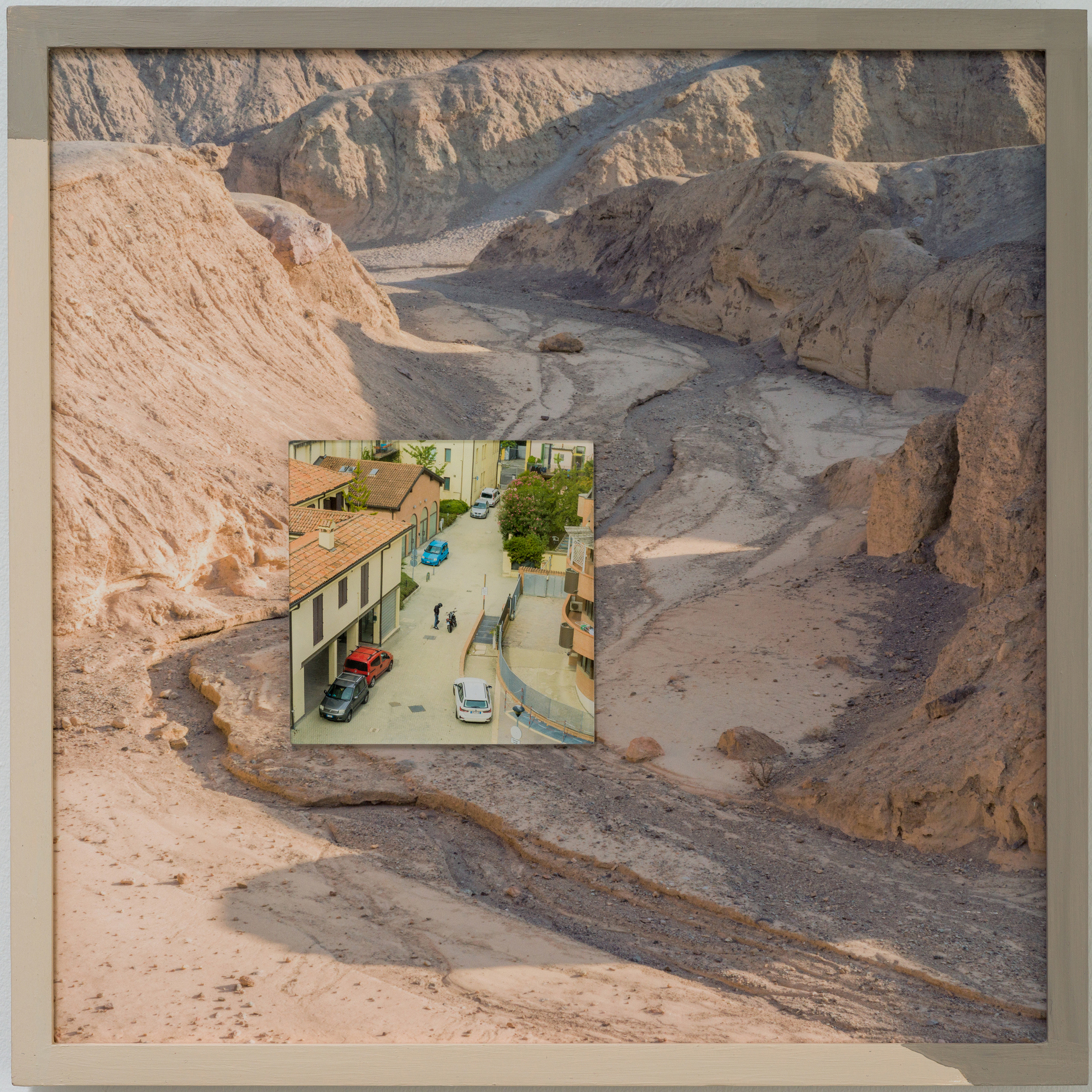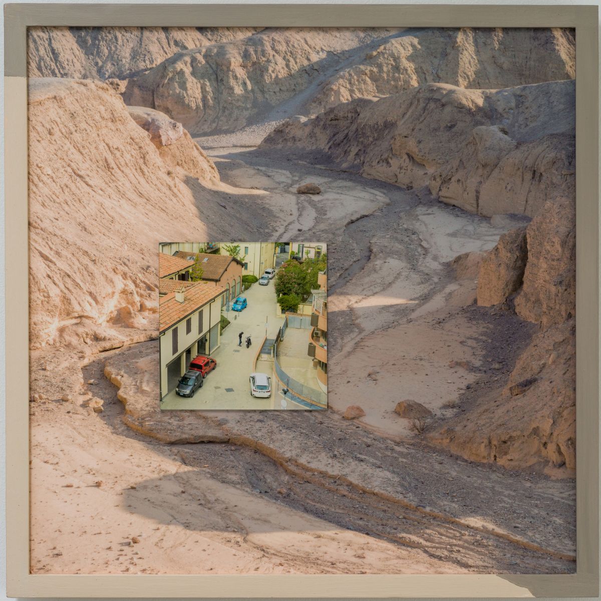 In this project I examine climate change through a lens of how humans chose to work with the geological landscape we are given. There have been 37 epochs in the history of the Earth. Humans have been here for less than two, but our impact has been greatly outsized. Nature will continue to reinvent itself, can we adapt with it? Will we be part of the next chapter? I have mounted scenes of human habitation behind acrylic, as if we can separate the things we do from having an impact on the natural world. I affixed these scenes within sweeping landscapes of the desert southwest United States, a stand-in for a future planet broadly shaped by rising temperatures. The constructed world behind the acrylic is protected, while the landscapes, though durably printed on aluminum, remain exposed. A continuity of line and color between these scenes points to their interconnectedness. The multi-layered images are finished with hand-painted wooden frames, alluding to the next chapter in the planet’s history. As the image pushes beyond its edges, the story continues to evolve.