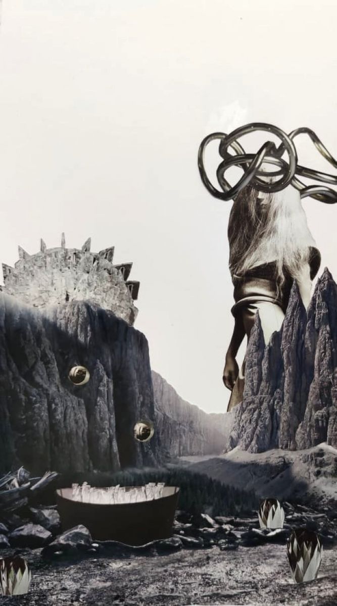 L’opera proposta rappresenta un paesaggio glaciale, la terra è spenta: una figura femminile avanza come un giocoliere surreale, ha come copricapo dei tubi d’acciaio contorto. Un contenitore con vetri rotti, fiori come carta: è la terra devastata e trasformata, senza più colori.