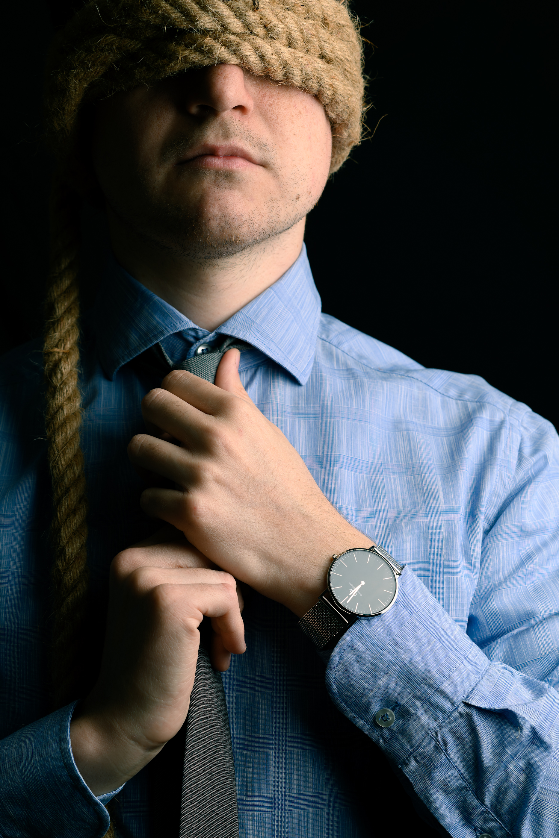 In un’istantanea carica di inquietudine, un uomo bendato con una corda di juta grezza si prepara meccanicamente ad andare al lavoro: quel limite, facilmente rimovibile, incarna la volontà di negare la realtà che lo circonda. L’ orologio fermo a 89 secondi da mezzanotte, evoca il Doomsday Clock e l’incombente apocalisse. Il gesto banale del rito mattutino – allacciarsi le scarpe, infilare il soprabito, sistemarsi la cravatta – diventa allora un atto di cieca persistenza, un macigno emotivo che denuncia la nostra testarda e cieca devozione alla routine nonostante il mondo stia precipitando verso, l’inevitabile, baratro.