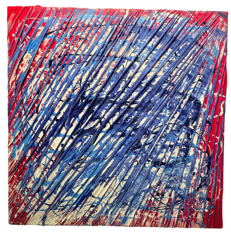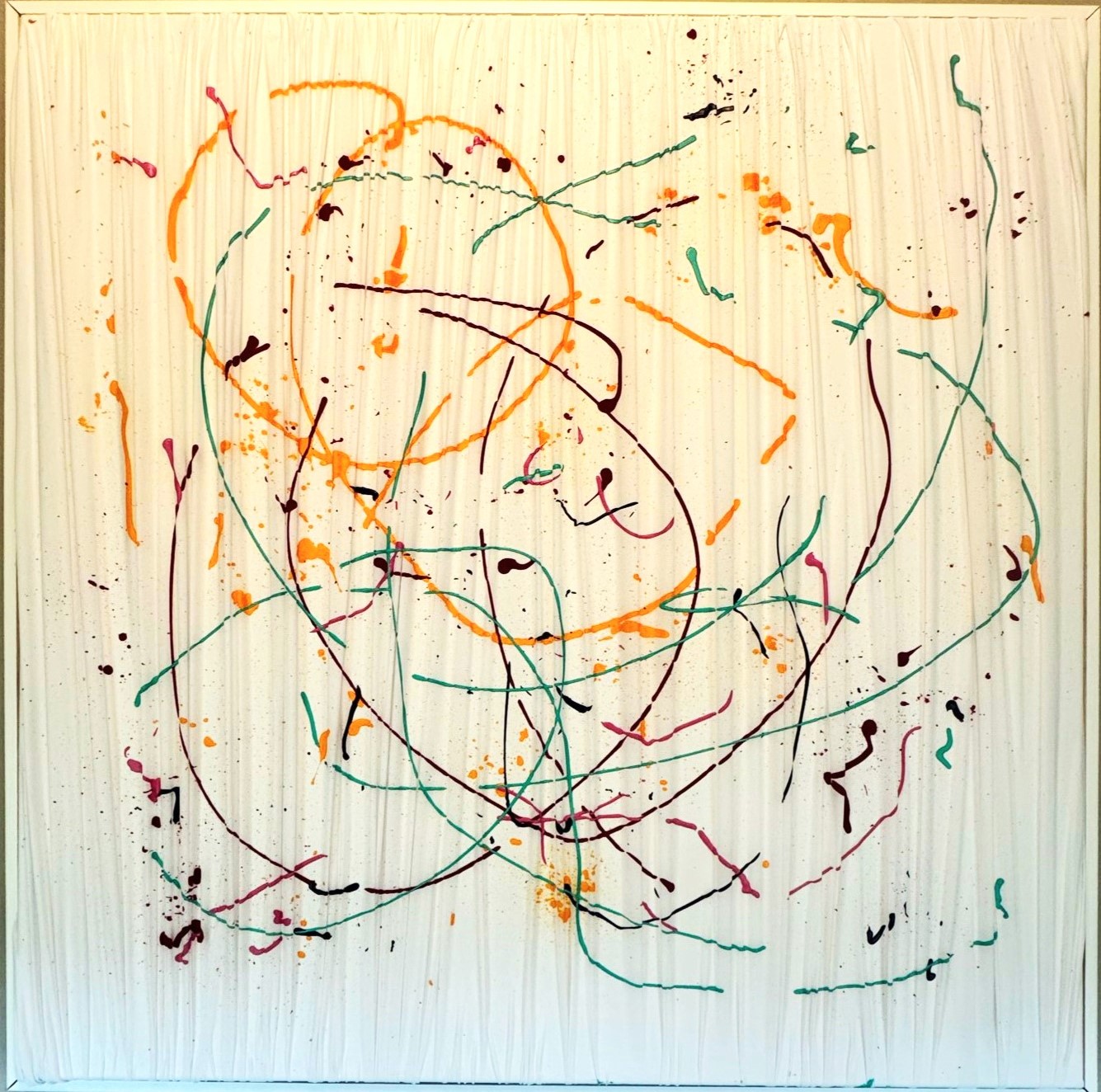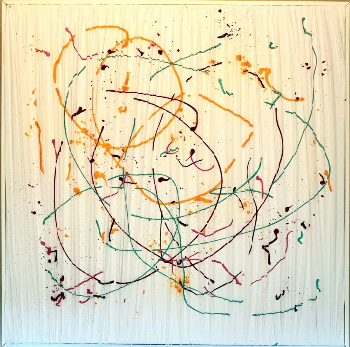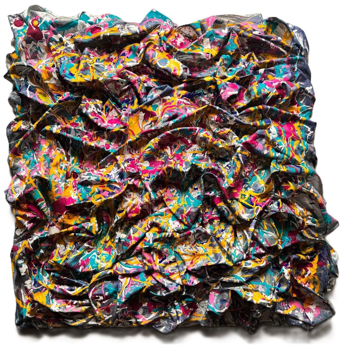 manipolazione tridimensionale a mano del tessuto su tela, per creare profondita e movimento. interventi pittorici in acrilico amplificano la percezione ottica dell’opera., lycra su tela