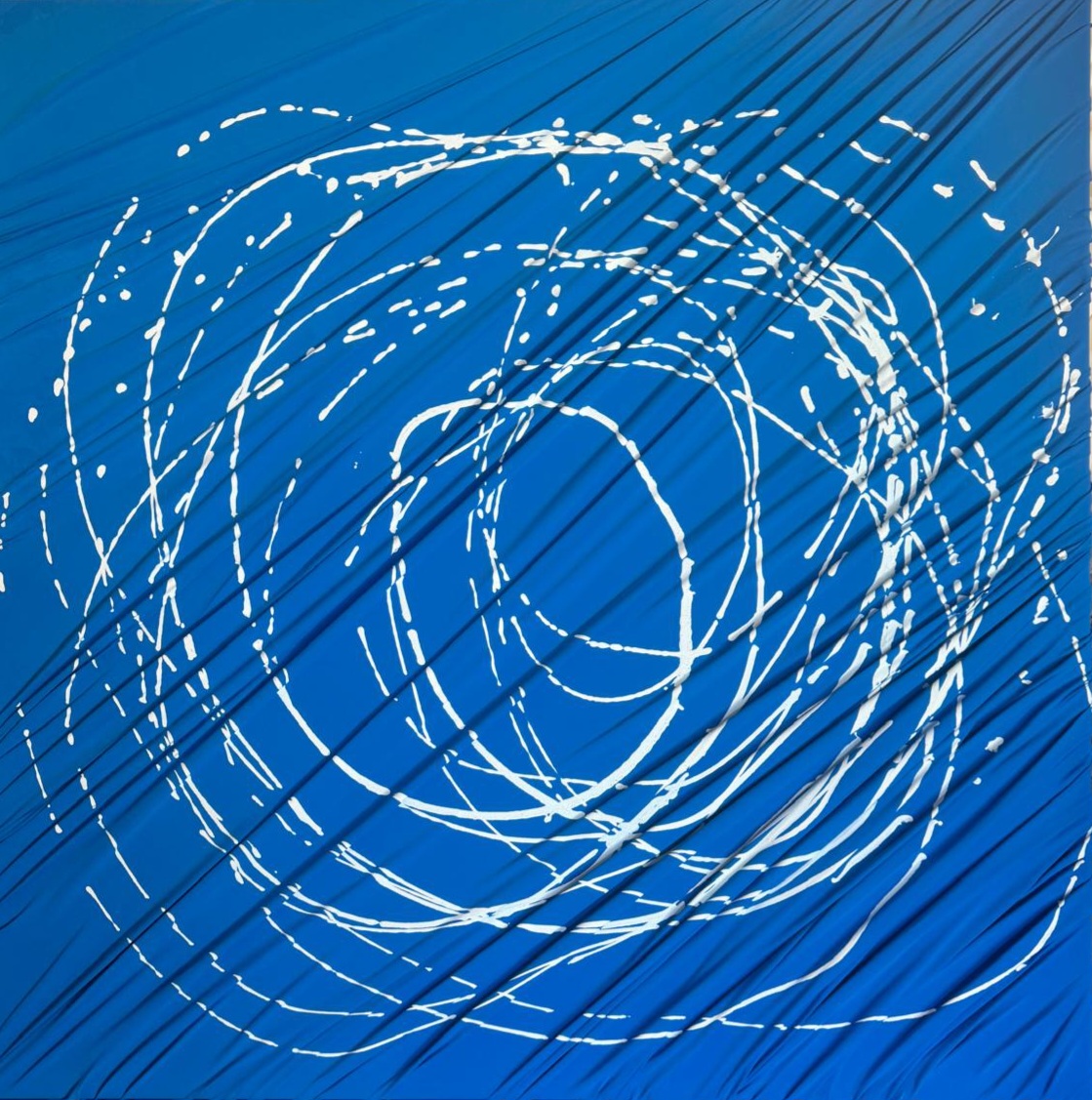 manipolazione tridimensionale a mano del tessuto su tela, per creare profondita e movimento. interventi pittorici in acrilico amplificano la percezione ottica dell’opera, lycra su tela
