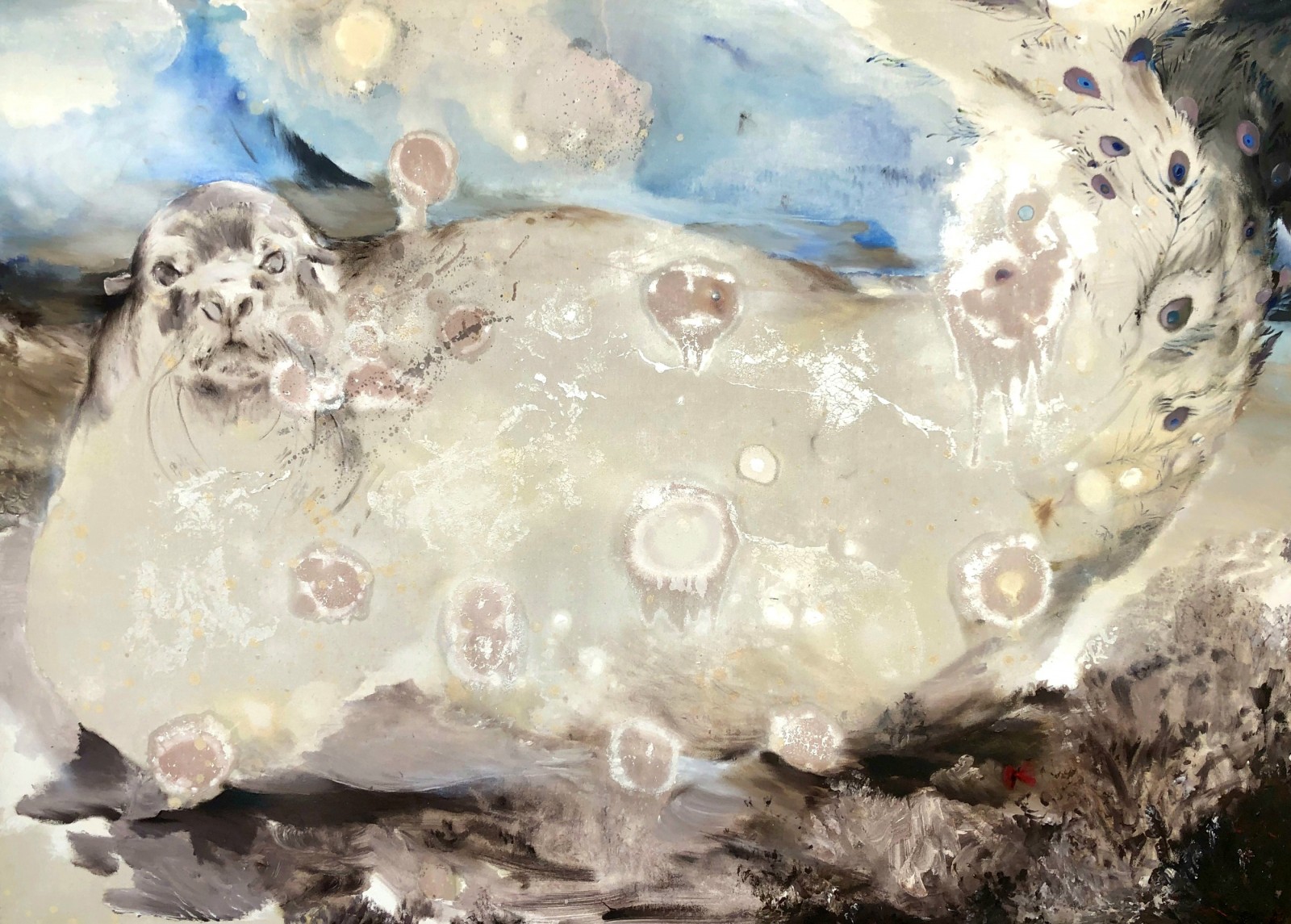 ”La foca vanitosa” è un’opera ironica ma riflessiva che ritrae una foca col broncio, intenta a trasformare una parte di sé in una sfarzosa coda di pavone. L’immagine colpisce per il contrasto tra la natura semplice e goffa della foca e la vanità ostentata del pavone, animale simbolo per eccellenza di bellezza e appariscenza.