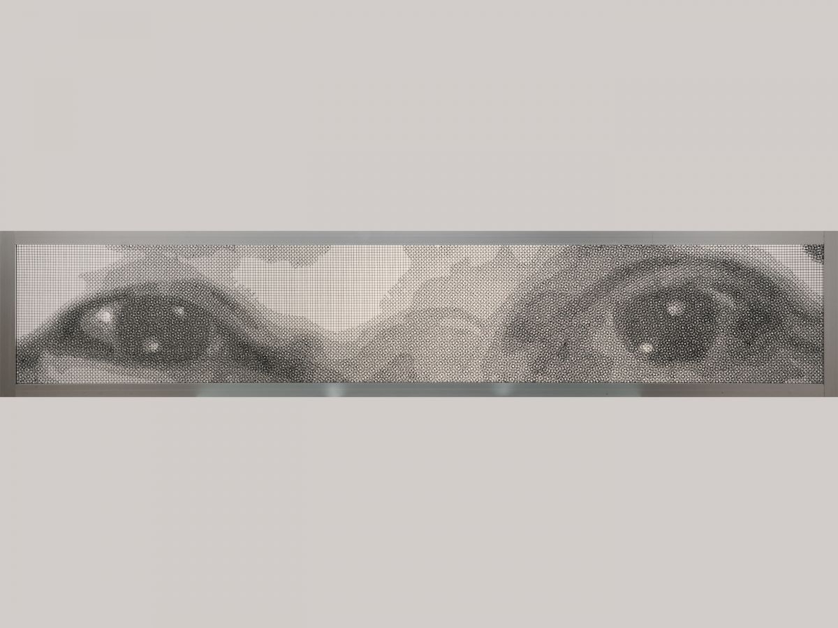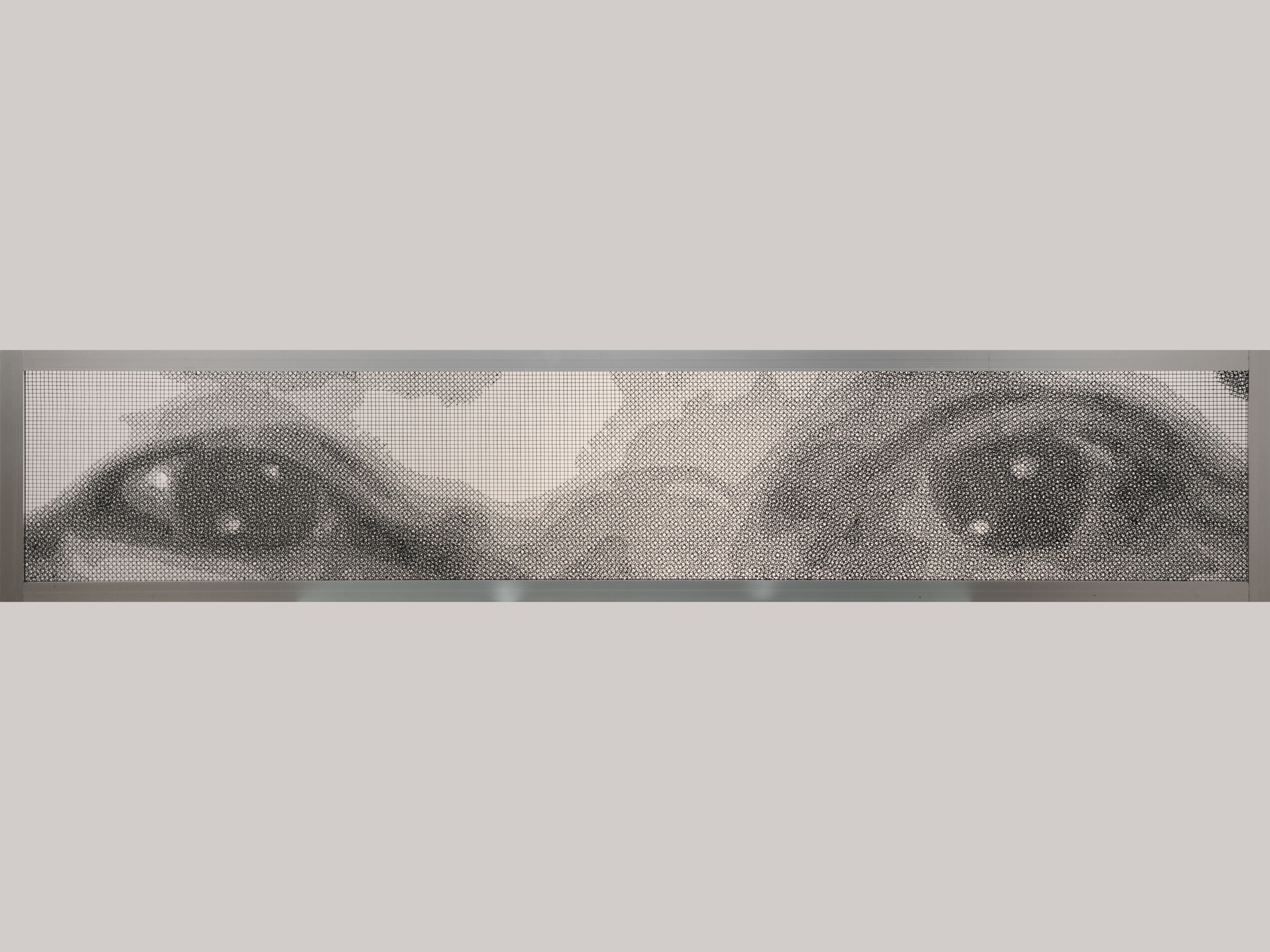The work is composed of eight layers of galvanized and painted metal mesh cut according to appropriate paths and superimposed until they form the illusion of an image: a female gaze; it is a metaphor of reality whose essence we can often appreciate only by observing it from afar.