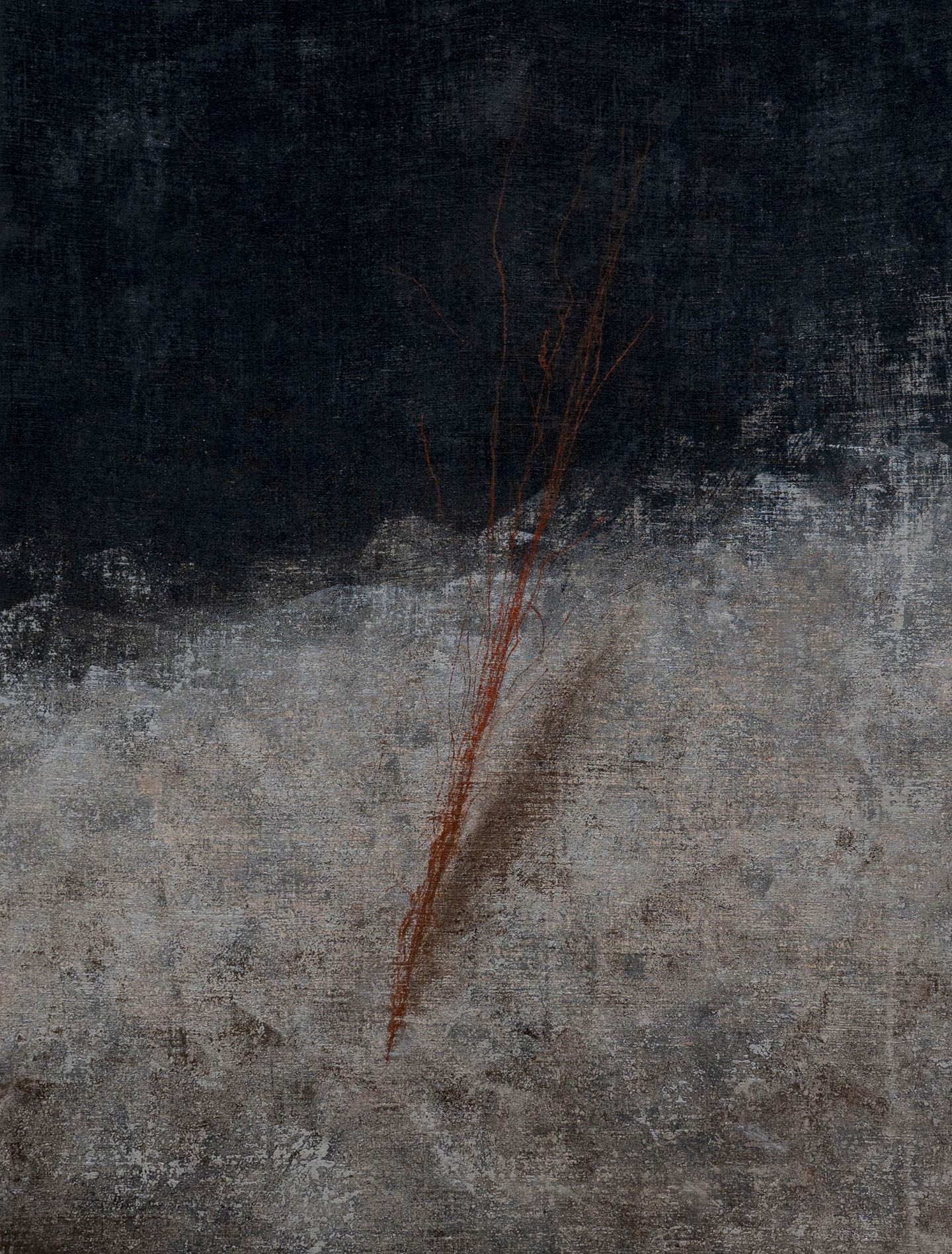 Il dipinto qui presentato è realizzato attraverso un procedimento del tutto grafico, appunto inchiostrando e stampando manualmente sulla tela varie matrici xilografiche incise a sgorbia e altri materiali di recupero.