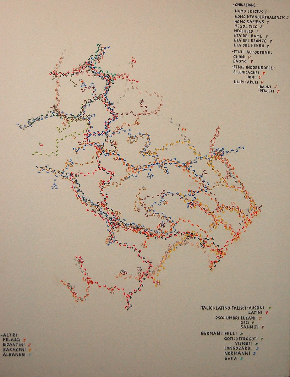 LA REGIONE BASILICATA RICREATA NON ATTRAVERSO LA SUA SUPERFICIE GEOGRAFICO MORFOLOGICA MA COME UNA SORTA DI MAPPA STORICO ANTROPOLOGICA , IN SCALA 1:250.000, ATTRAVERSO I PERCOSRSI DI OMINIDI E DEI POPOLI, OGNIUNO DI UN COLORE DIVERSO IDENTIFICABILE NEL COLORE DEL PIEDINO NELL APPOSITA LEGENDA, CHE NEL CORSO DEI MILLENNI L HANNO ATTRAVERSATA, RAGGIUNTA E POPOLATA FINO A COSTITUIRNE L ATTUALE TESSUTO ETNCICO CULTURALE