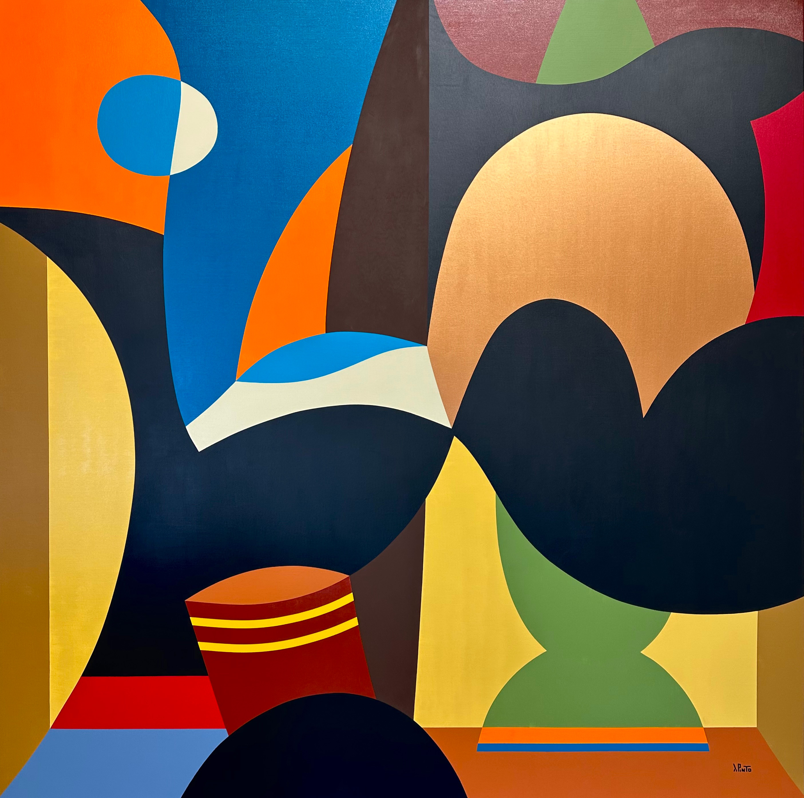 Afrodite è parte della serie Netti, una delle più riconoscibili e mature nella produzione di DiPinto. L’opera si caratterizza per campiture nette, colori pieni e composizioni geometriche che costruiscono una figura archetipica attraverso forme pure e un’energia cromatica intensa.