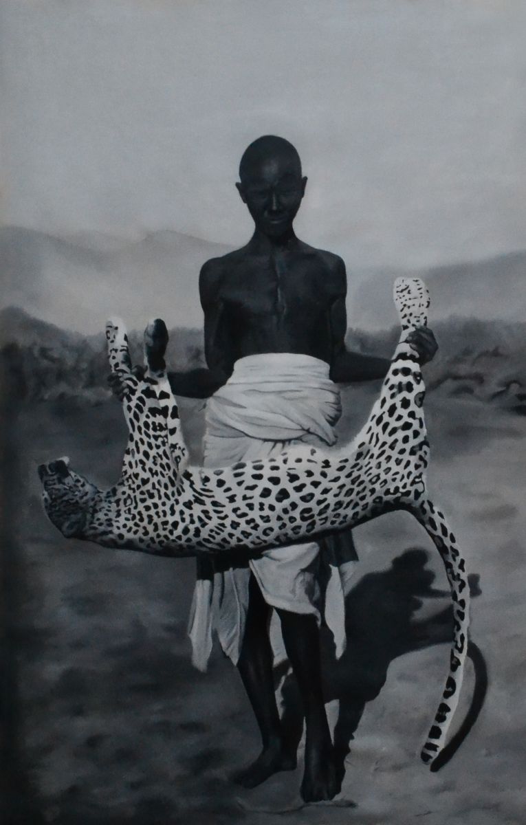 L’immagine raffigura una figura etiope seminuda, ritratta frontalmente mentre regge il corpo di un leopardo morto. Il soggetto umano è reso in forte contrasto chiaroscurale, mentre la carcassa dell’animale risalta per la vividezza del manto maculato. L’ambientazione è spoglia e polverosa, evocativa di un contesto africano arido. L’opera è una riproduzione grafica di una fotografia storica risalente al periodo dell’occupazione fascista in Etiopia, tra il 1935 e il 1941.