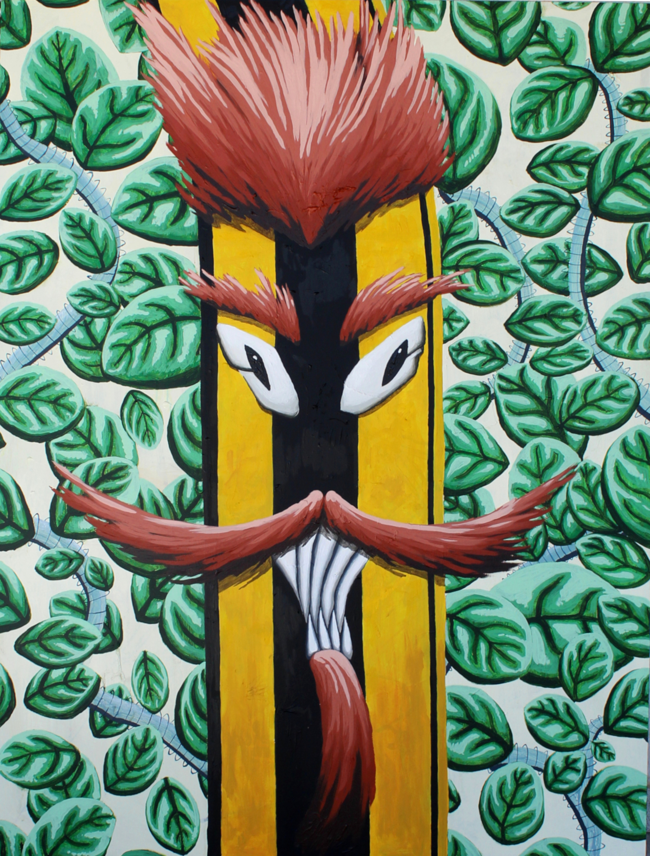 Ad uno sfondo composto da elementi naturali e artificiali, qui concretizzati attraverso l’uso di una pittura che usa una linea quasi decorativa, si sovrappone, a contrasto, e attraverso una materia ben più decisa e corposa, anche nella scelta dei toni e della cromaticità, il soggetto di una ”matita animata” dagli echi surreali e pop.