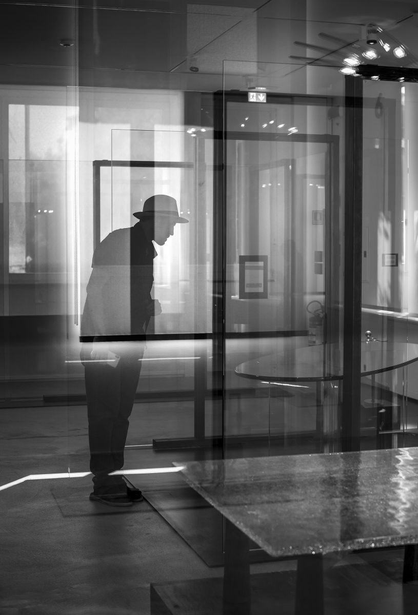 The choice of black and white is useful for creating a synthesis between the reflective surface and the dimension of the observer.