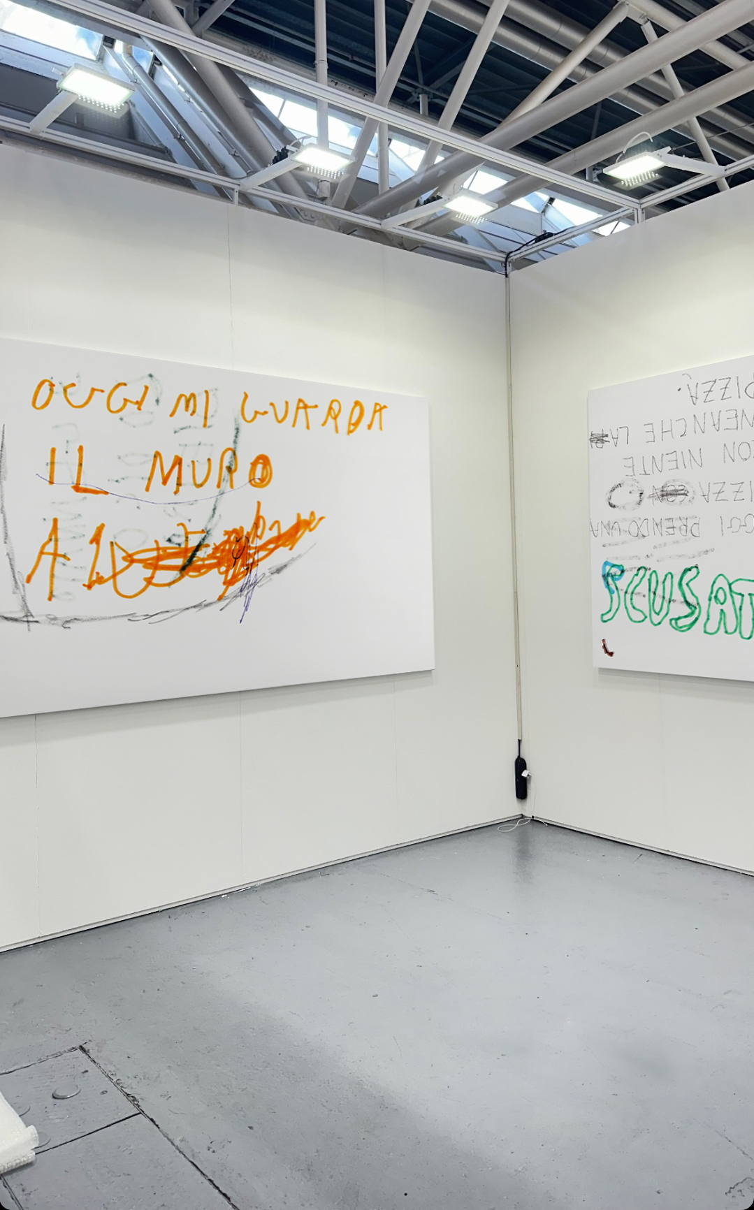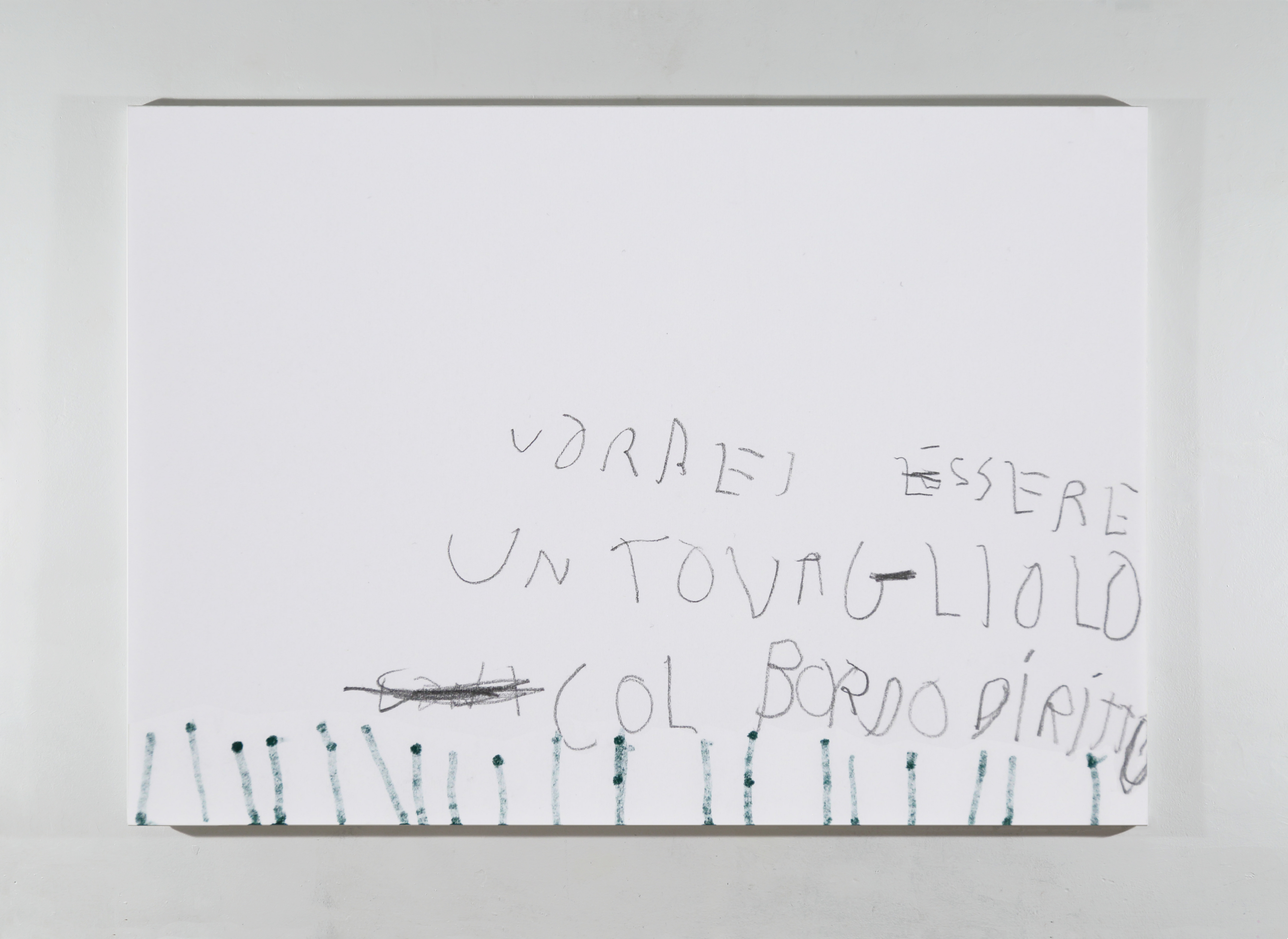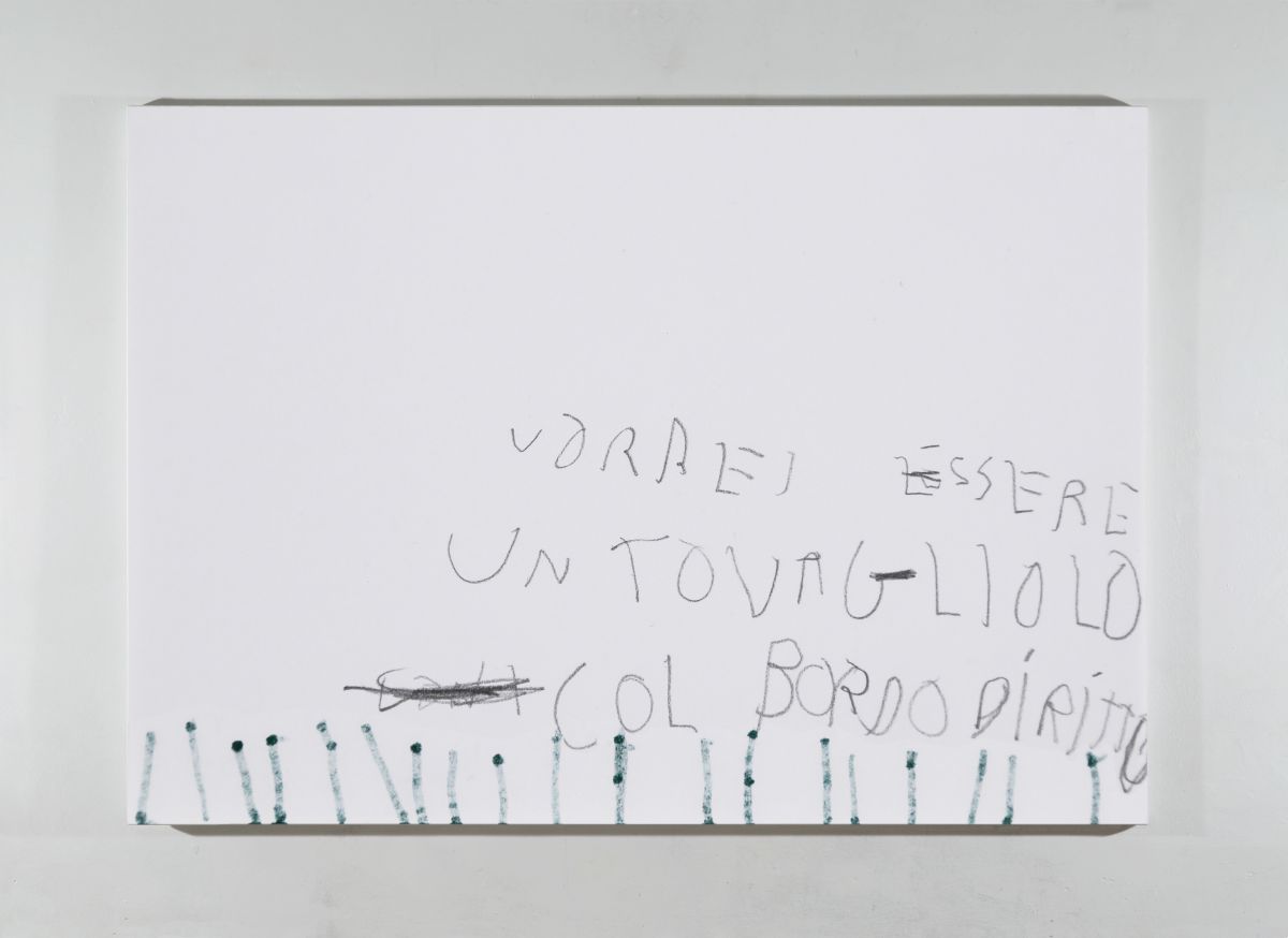 ”Autoritratto 20/04/2025” è un’opera che fa parte della serie pittorica ”Diaries”. L’autoritratto si presenta sotto forma di “scritta dipinta” realizzata avendo a modello una pagina scelta tra i miei diari infantili. Queste “scritte dipinte” propongono una riflessione attorno al sottile rapporto che lega la figurazione al linguaggio, le immagini alle parole. Le immagini/parole che si possono “osservare” o “leggere” sono dipinte minuziosamente, attraverso la pittura a olio, con l’intento di ricreare sulla tela la texture del pennarello, della matita o della penna. L’effetto illusorio ottenuto tramite la pittura a olio fa emergere frasi, cancellature e segni che traspaiono dal retro del foglio. Così, diverse pagine, diversi stati d’animo e quindi diversi momenti temporali convivono e dialogano in un medesimo spazio che è la tela dipinta.