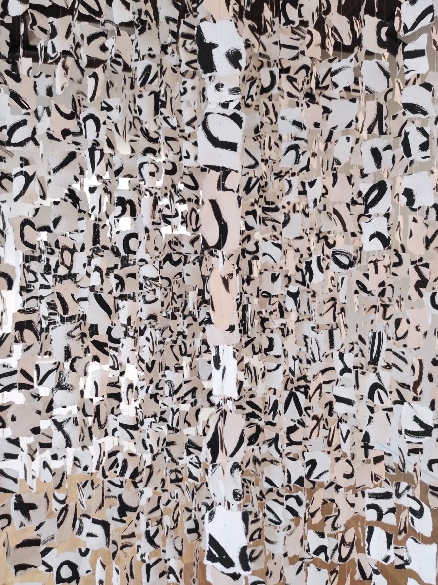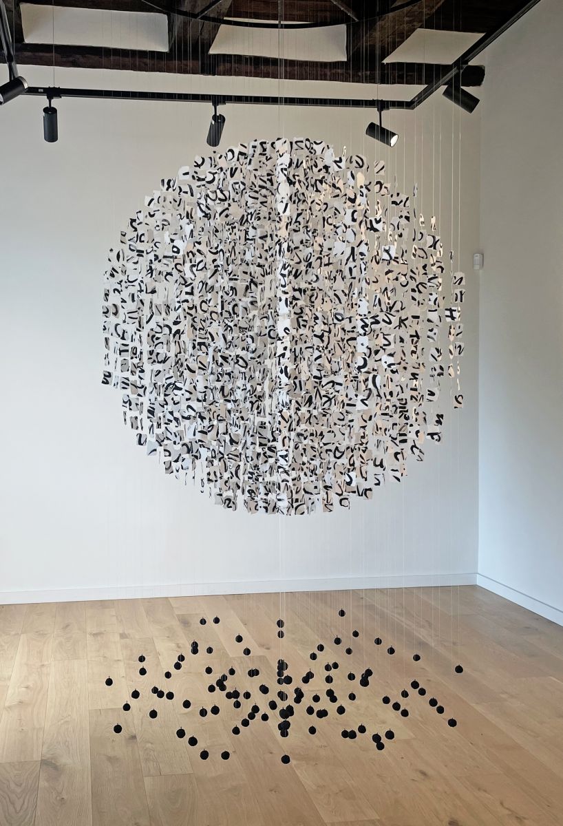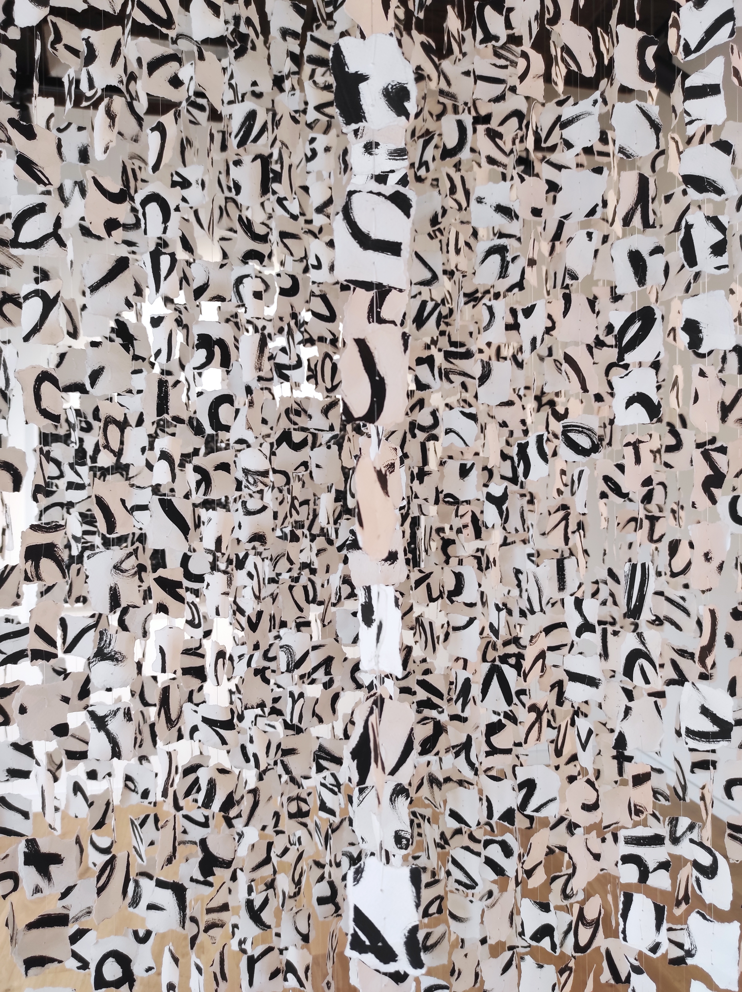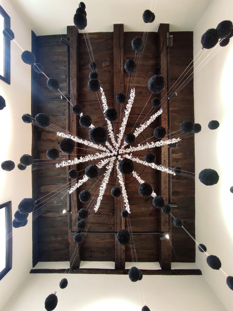 Frammenti di memorie personali rinascono sotto una nuova forma, in bilico tra la precarietà del pensiero e la nostra fragilità. Questa installazione esplora il delicato equilibrio tra materia e vuoto, nell’atto di sospendere, non inteso solo come elevazione, ma anche come interruzione. L’opera è composta da frammenti di carta distrutti e poi riassemblati in una forma nuova, sospesa e instabile. Questi ultimi sono appesi ad un filo sottile e gravati da un peso differente come ad evocare la tensione unica di ogni ricordo. Un equilibrio precario tra implosione ed esplosione, tra presenza e assenza, tra ricordo e oblio. Fragili sospensioni è un invito a rallentare, ad ascoltare ciò che non fa rumore, a compiere un viaggio introspettivo per riconnetterci al senso più autentico delle cose.