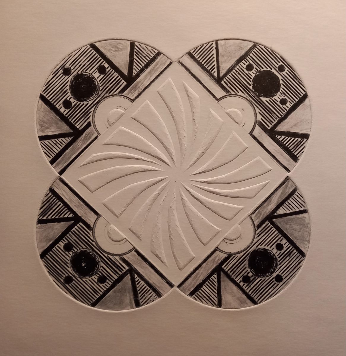 L’immagine nei semicerchi è una composizione di forme che creano delle decorazioni astratto geometrico, mentre la goffratura rappresenta un vortice, simbolo di andare oltre l’ignoto.