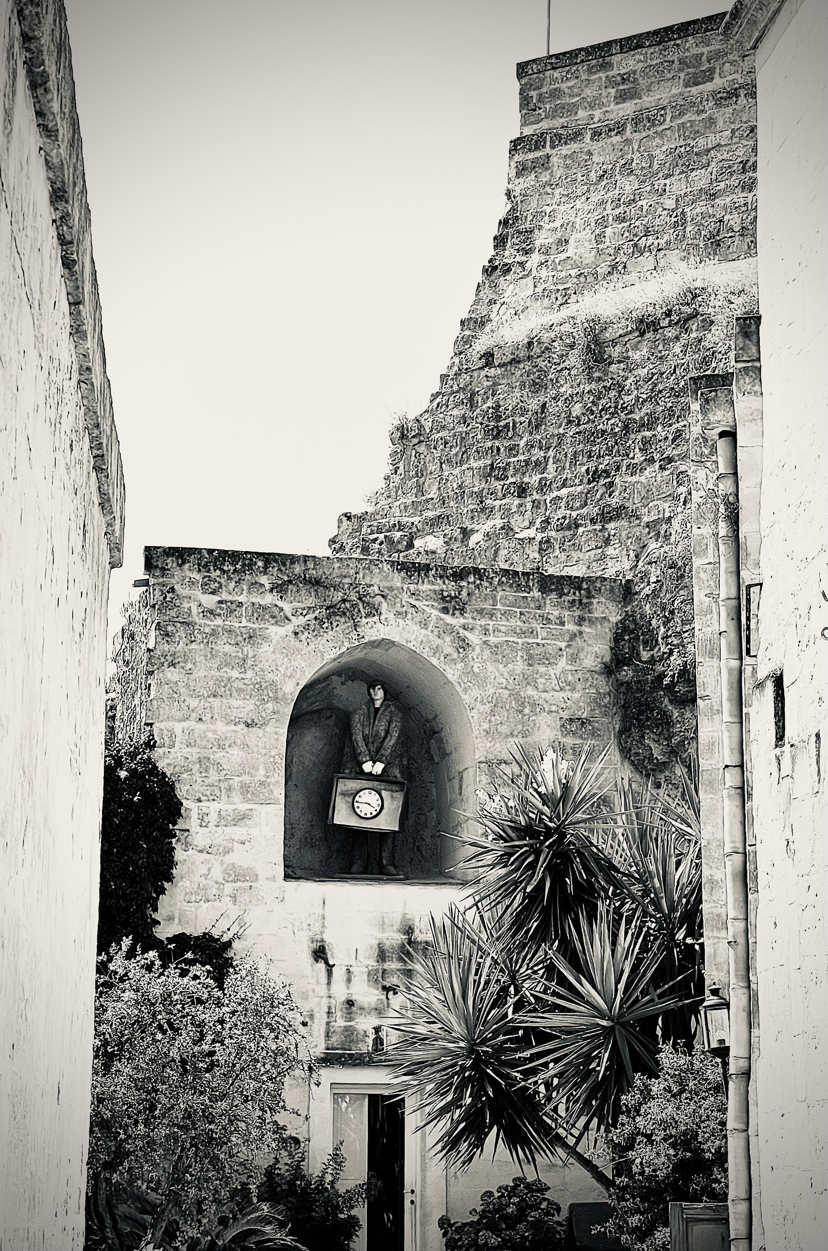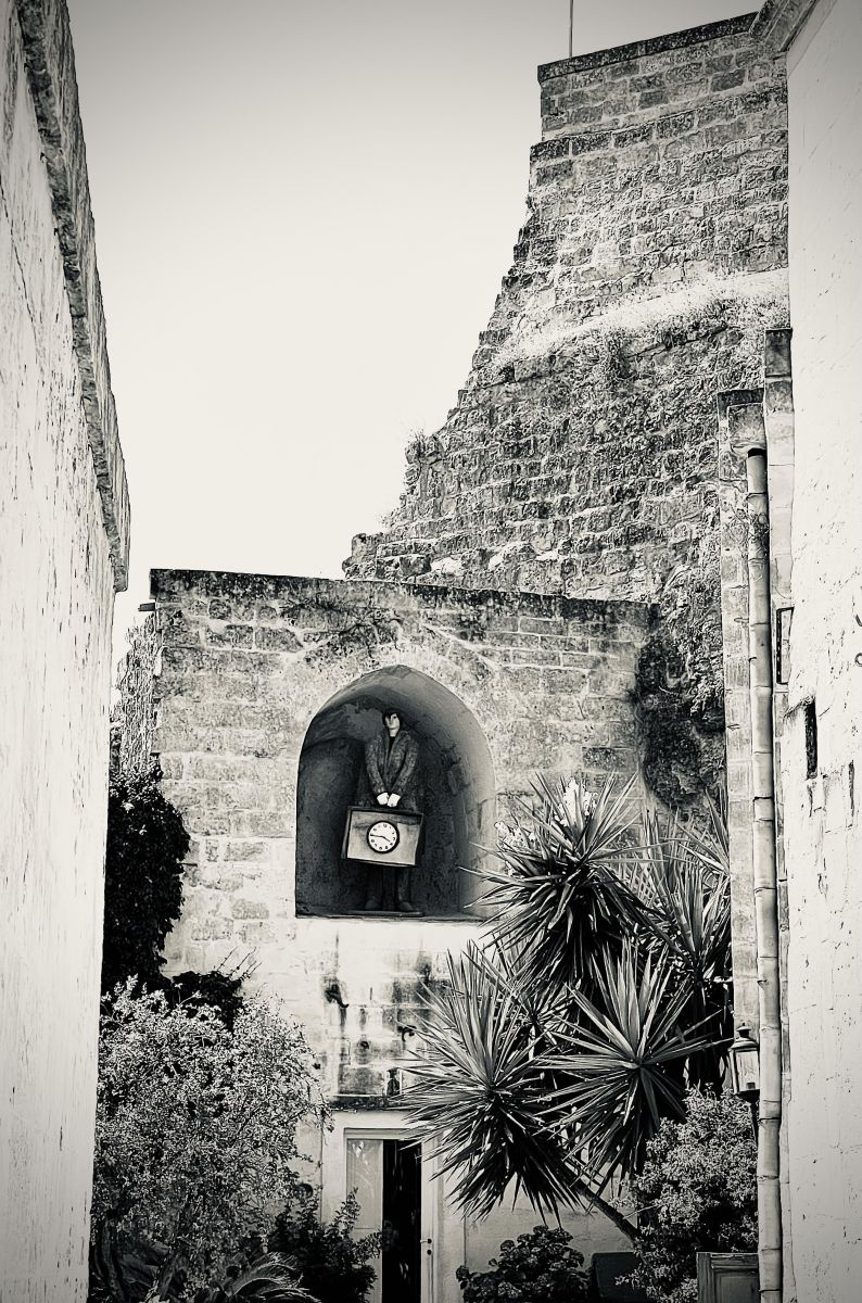 La figura con l’orologio richiama il Bianconiglio di Alice nel Paese delle Meraviglie, simbolo del tempo che scorre inesorabile e dell’ansia del ritardo. Il suo aspetto misterioso e leggermente inquietante amplifica il senso di urgenza e di surrealismo. Il muro in rovina e la nicchia con la statua evocano un senso di passato e di storia, mentre il contrasto tra la vegetazione rigogliosa e la pietra consunta suggerisce il trascorrere del tempo e la fusione tra natura e costruzione umana. L’uso della luce naturale e delle ombre profonde conferisce un’aria drammatica alla scena, accentuata dalla figura scura e dalla texture delle mura. Il tutto crea una sensazione di mistero e introspezione.