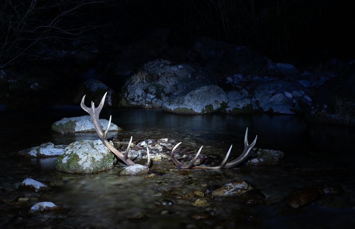 Un palco di cervo emerge dall’oscurità, sospeso tra visione e realtà, come un’apparizione sacra.