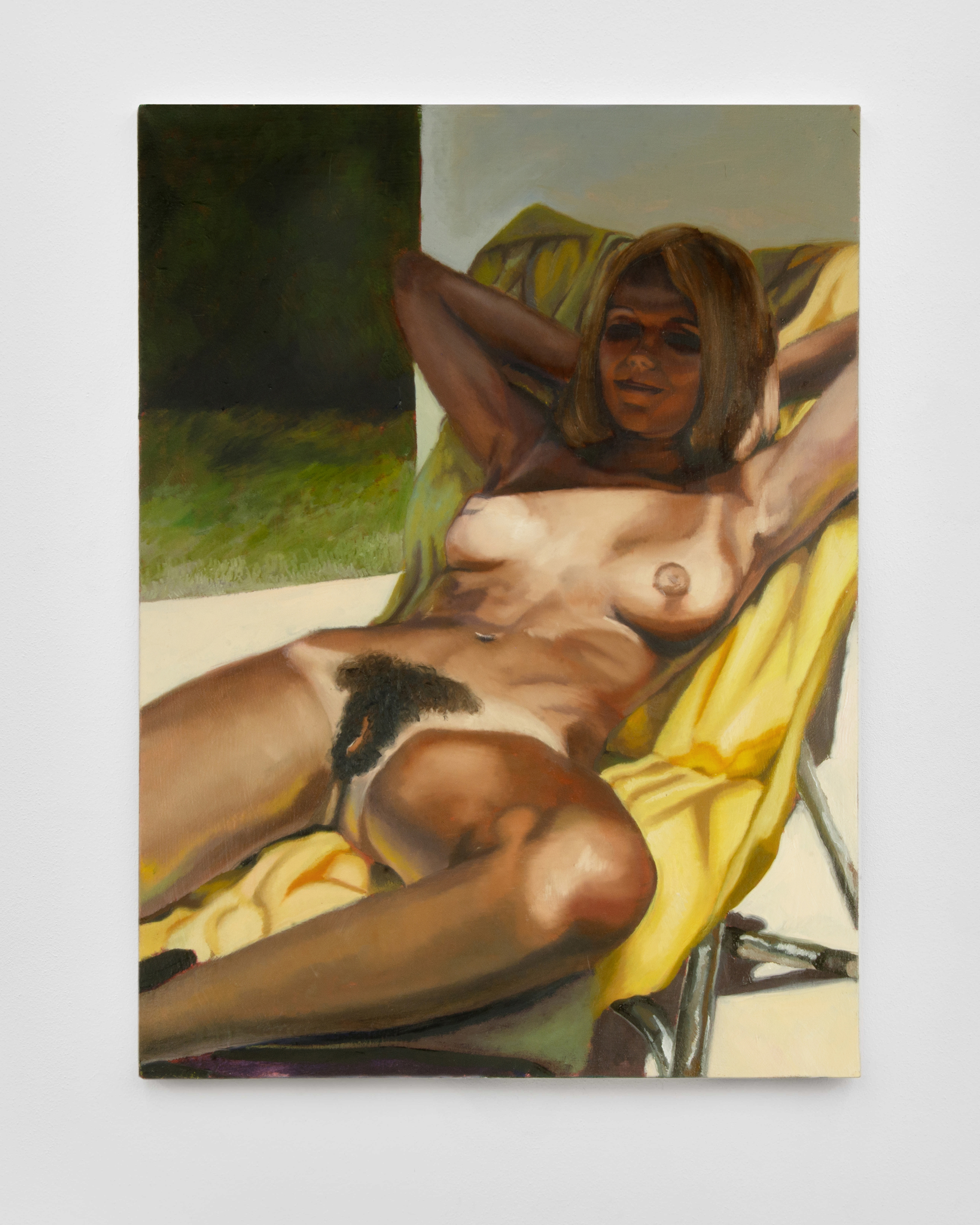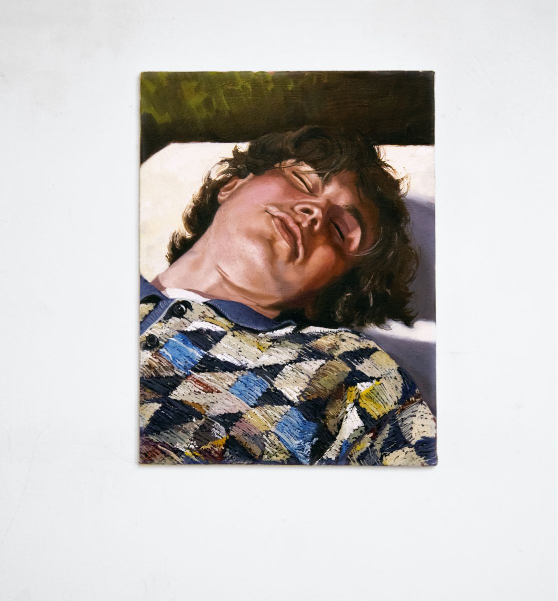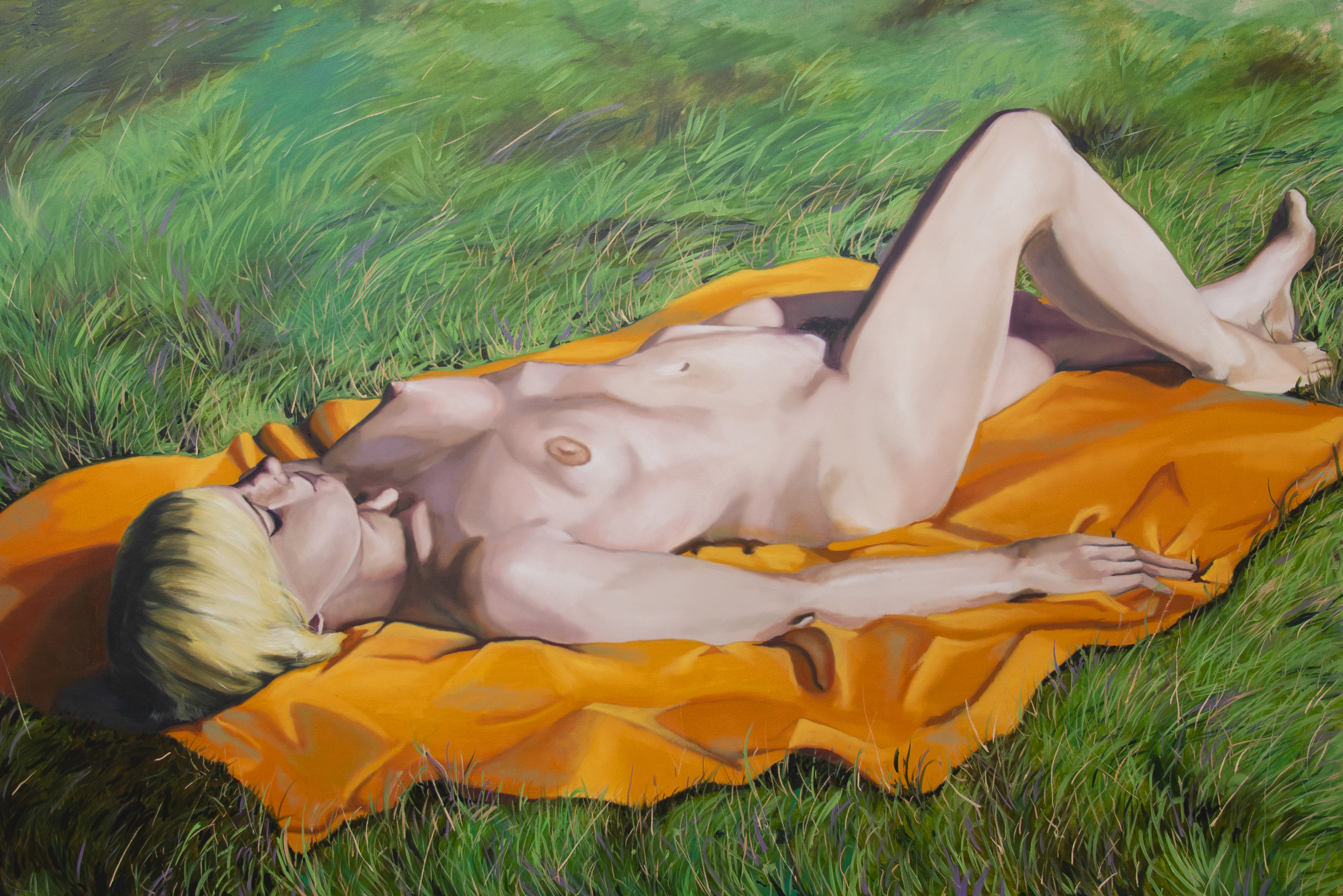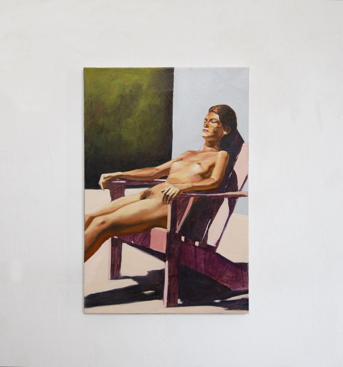 In questo dipinto, il soggetto sprofonda nella dimensione del telo. La figura è rilassata ma il viso è parzialmente contratto: l’accenno di un sorriso in un momento di raccoglimento in sé stessi. Il corpo diventa un involucro pesante che permette alla nostra coscienza di scivolare attraverso i suoi due centri di gravità, testa e pube. Il volto nascosto dal taglio d’ombra, evidenzia il focus di questo lavoro, la capacità di appartarsi dal mondo esterno.