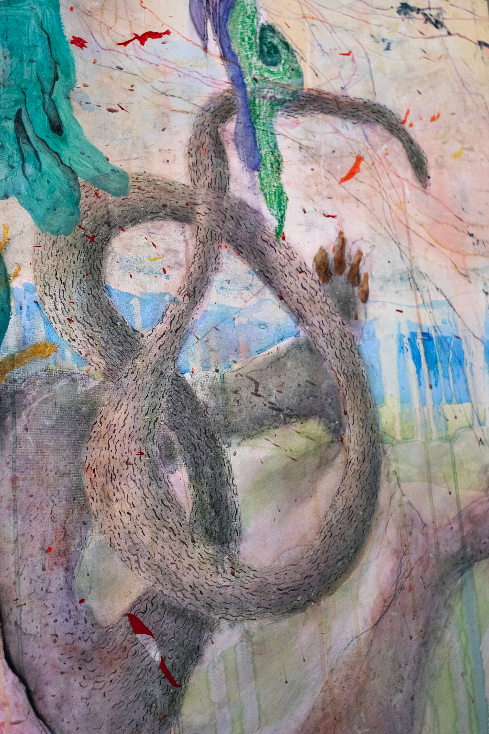 Al centro della composizione si staglia una figura androgina, che fonde tratti maschili e femminili, rafforzando così la sua dimensione archetipica e universale. Il volto, segnato da uno sguardo intenso e solenne, è incorniciato da capelli scompigliati e da una leggera aureola luminosa, che ne sottolinea la natura spirituale. Le ali, scure e profilate da un verde serpeggiante, evocano una duplice identità sospesa tra l’angelo e il demone, tra purezza e corruzione.
