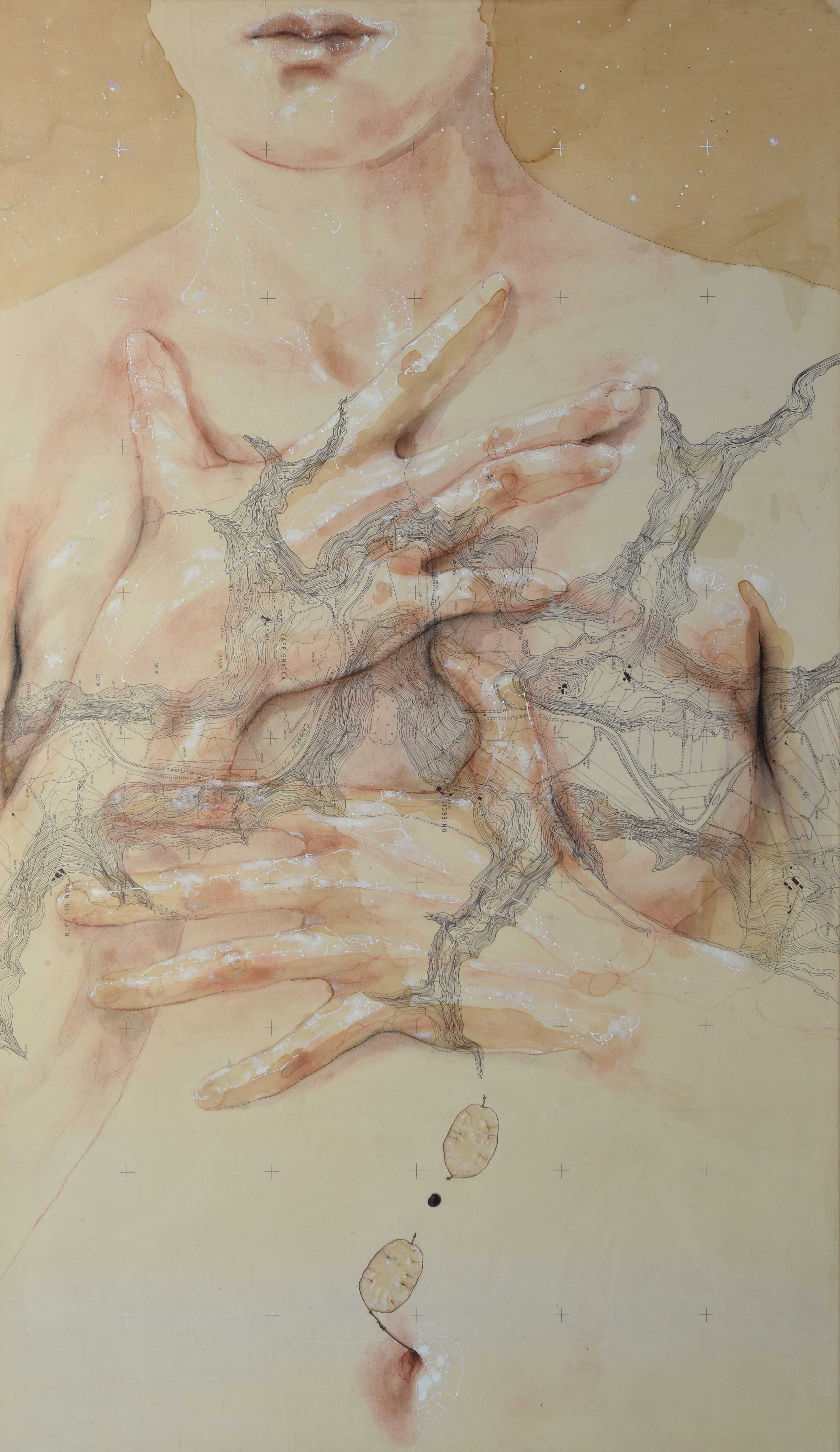 Mi affascina la similitudine tra il complesso disegno tecnico di queste carte e la biologia, un microcosmo nel macrocosmo. Nelle opere “spaziotempo” il corpo trascende i confini della mappa terrestre che muta in mappa celeste.
