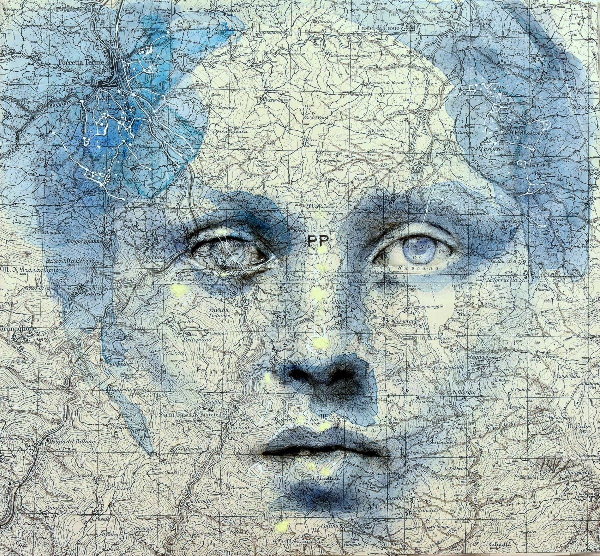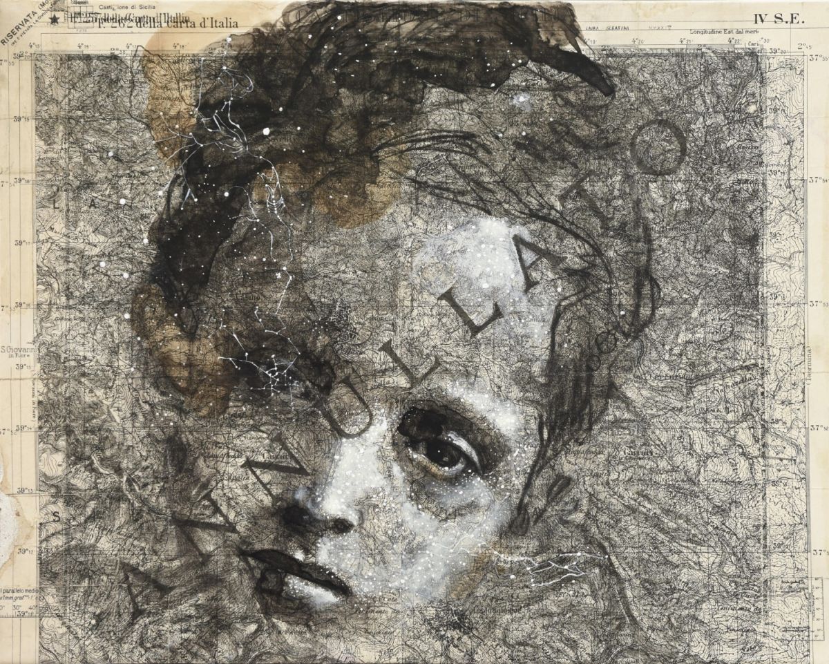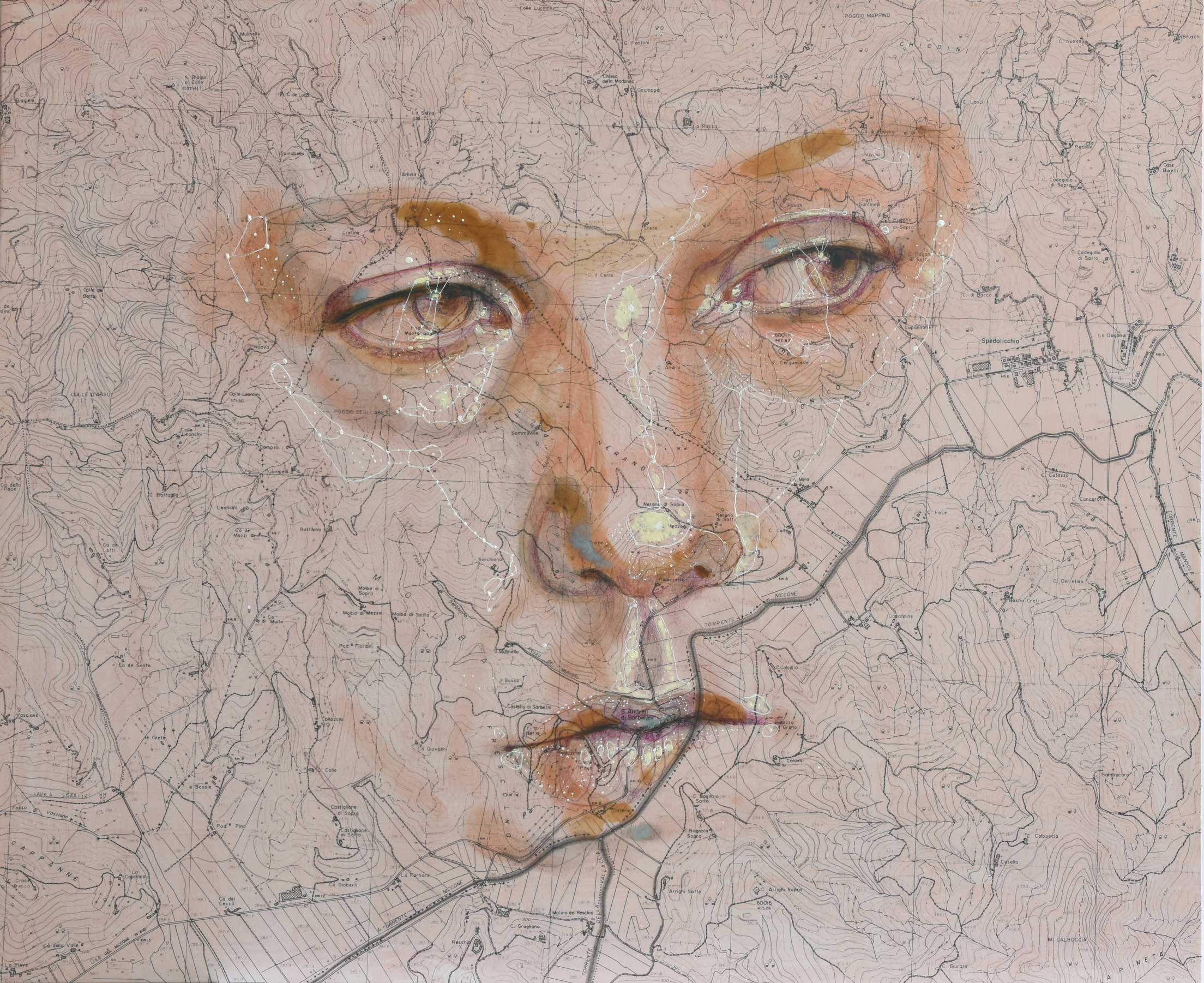 Uno stile figurativo in costante evoluzione mi ha portato ad utilizzare come supporto autentiche vecchie mappe e carte tecniche , elevandole al ruolo di trama/destino, quasi un DNA tracciato sulla pelle e reso visibile con linee, numeri, parole e punti. Attraverso un disegno puro, monocromatico, fatto di dettagli, ombre e spazi vuoti, la rielaborazione delle carte tecniche in senso antropologico diventa il mio modo di rendere quegli oggetti fondati su astrazioni, rappresentazioni visive della nostra identità.
